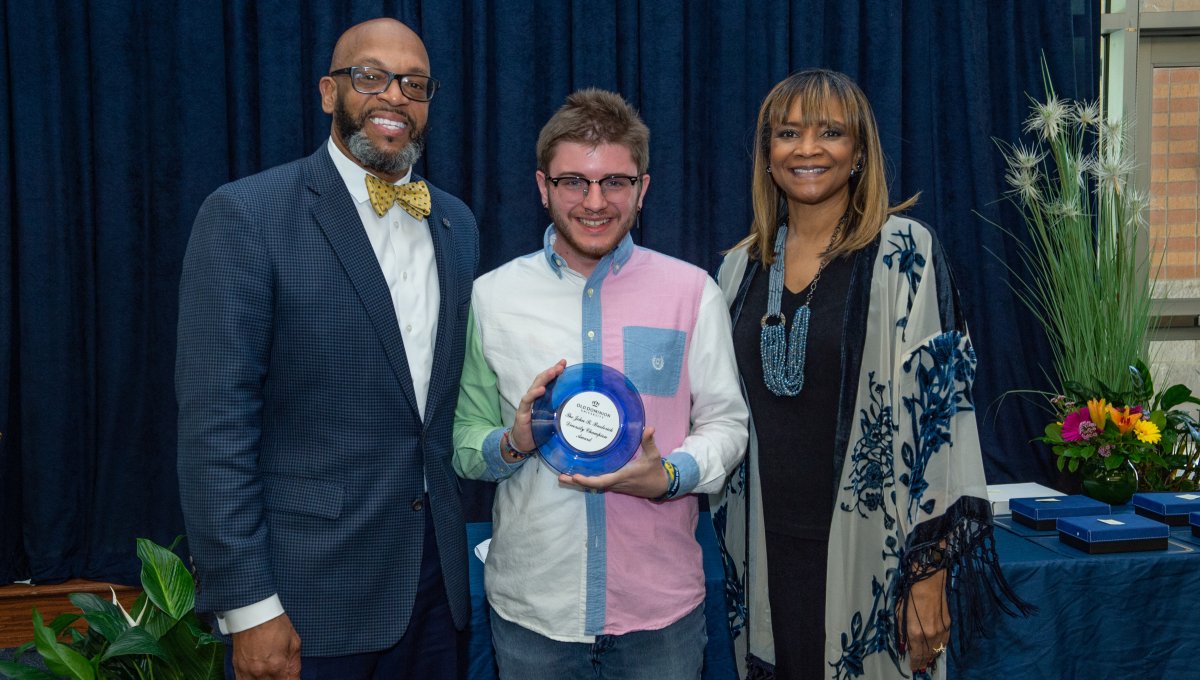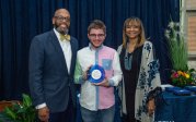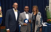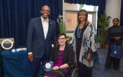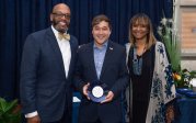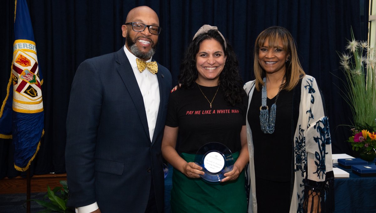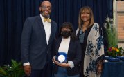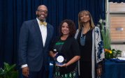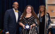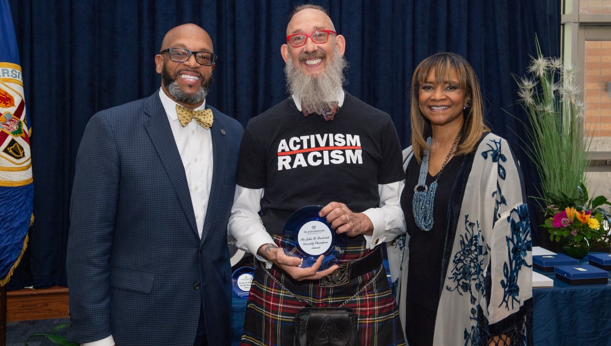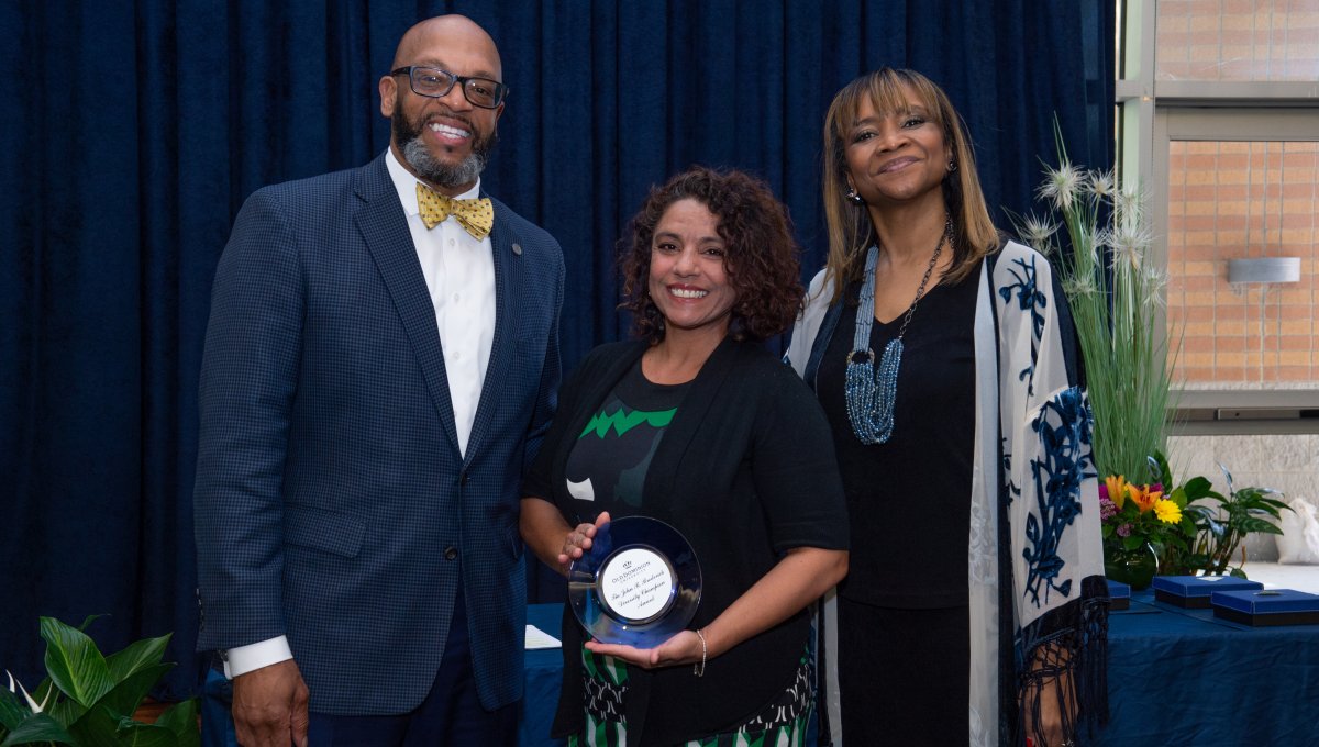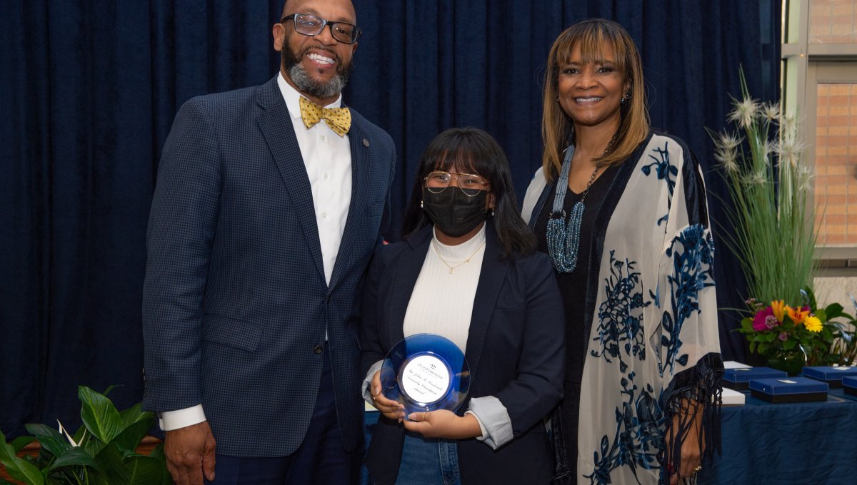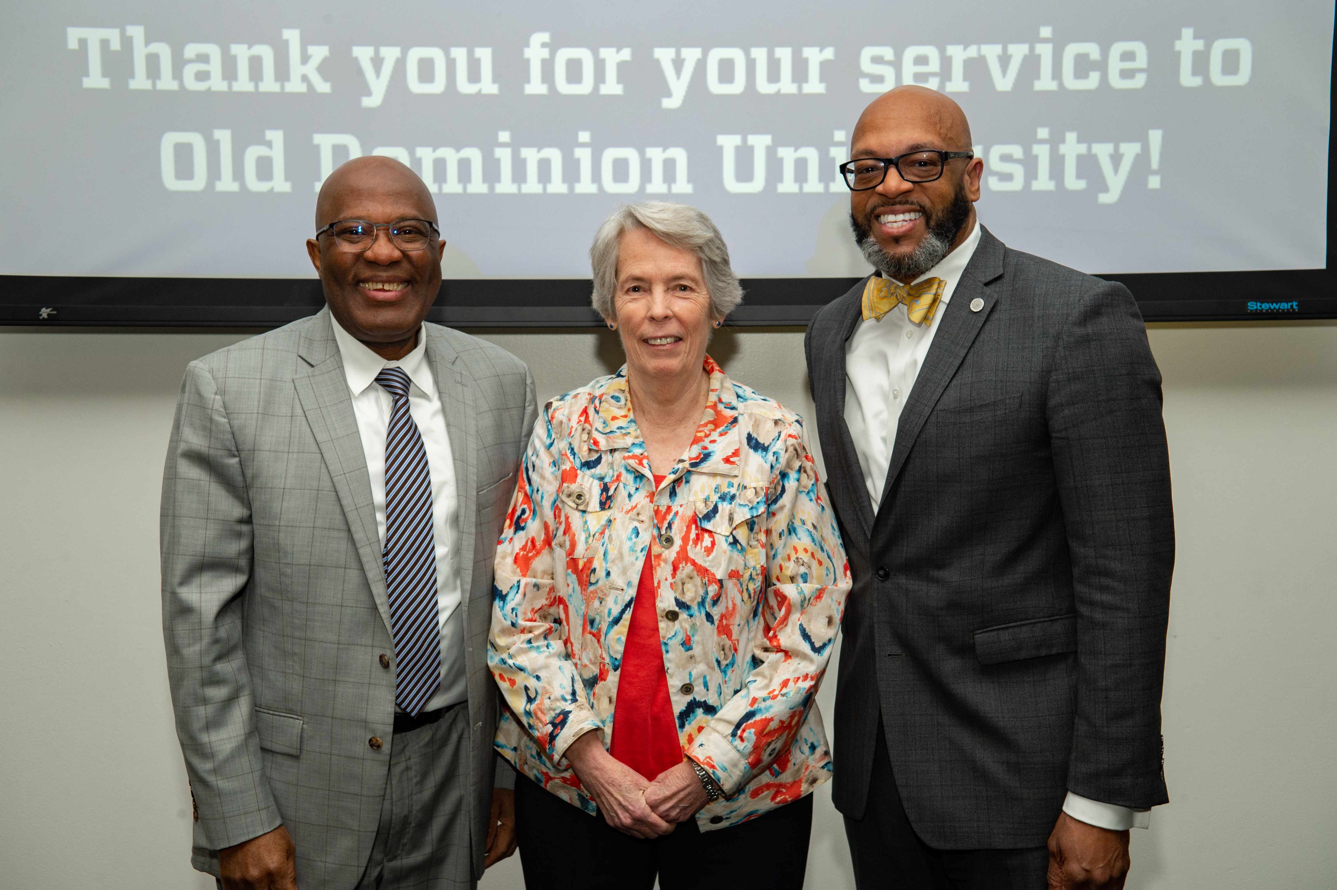 Award-winning actress Angela Bassett receives a Doctor of Humane Letters degree from Board of Visitors Rector Bruce Bradley and Provost Austin Agho. Photo Nicholas Clark/ODU
