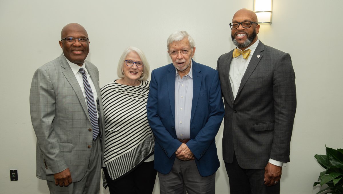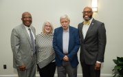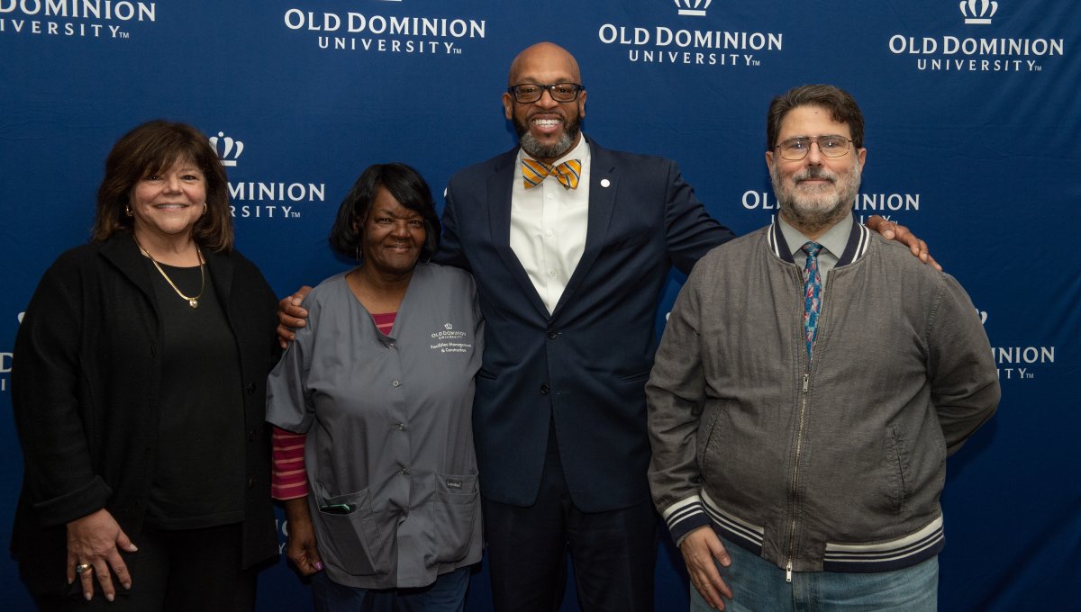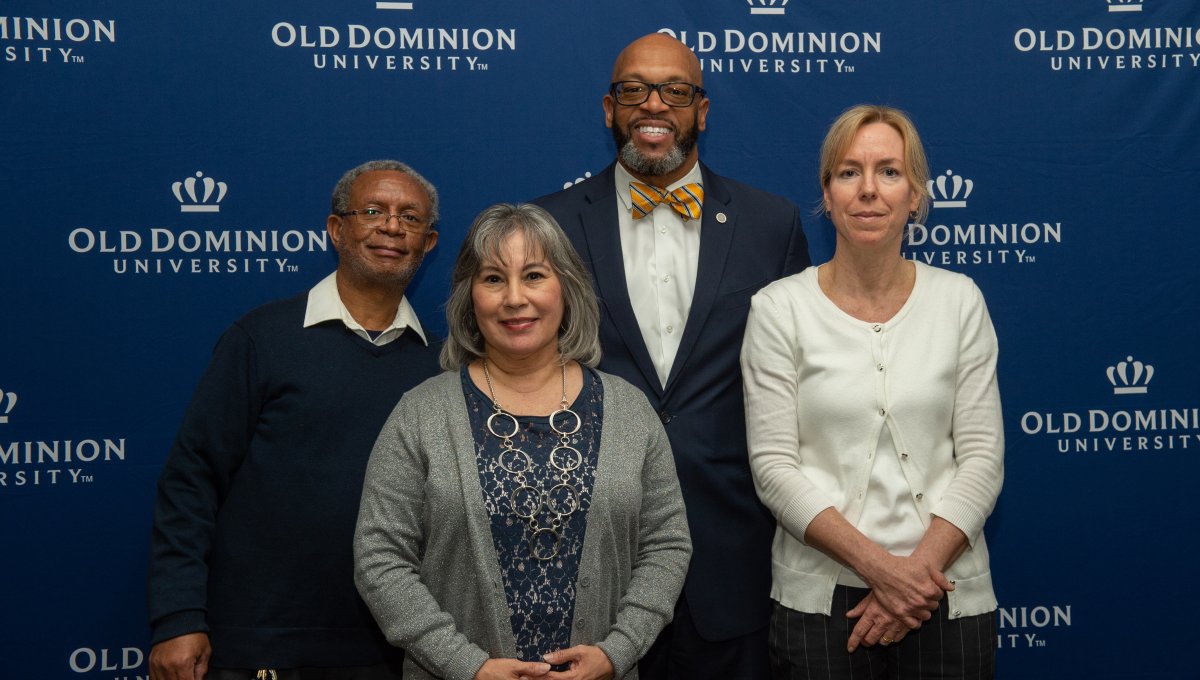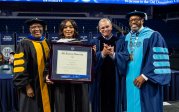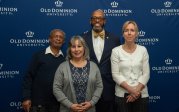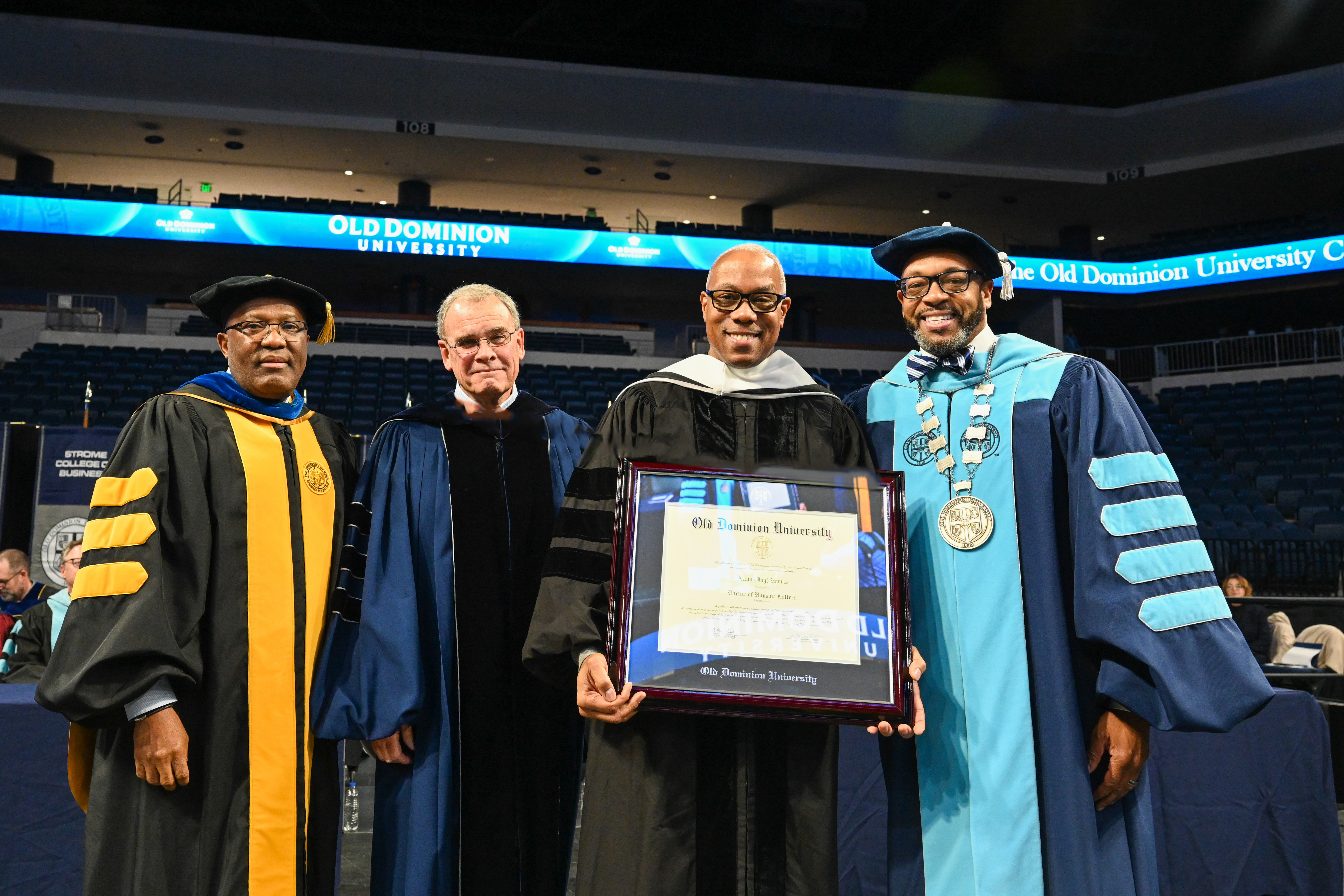 ESPN SportsCenter anchor Jay Harris receives an honorary degree from President Brian O. Hemphill, Ph.D. Pictured (from left) Provost Austin Agho, BOV Rector Bruce Bradley, Harris and President Hemphill. Photo Chuck Thomas/ODU