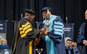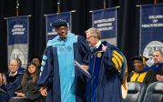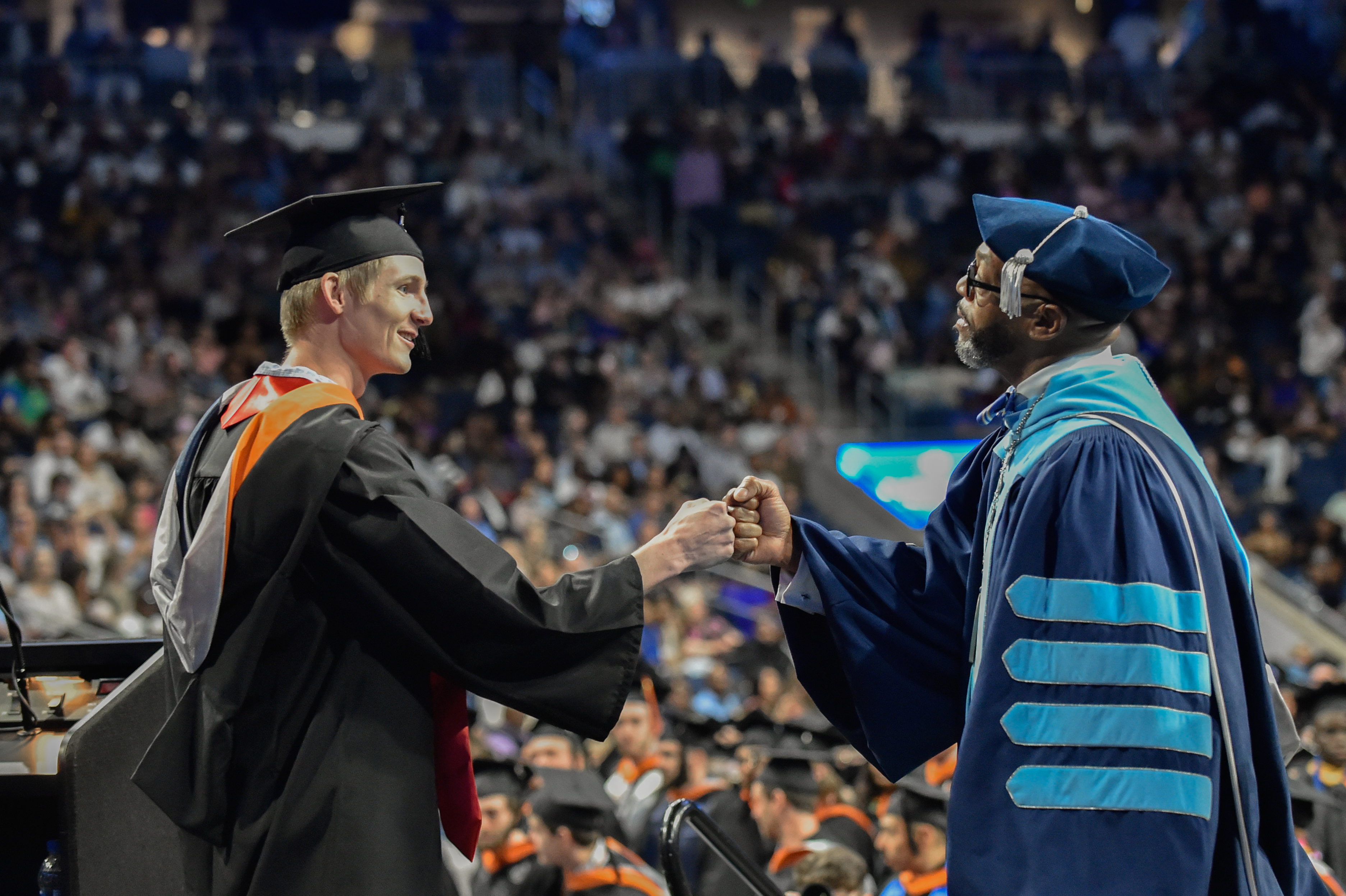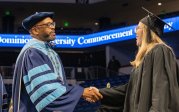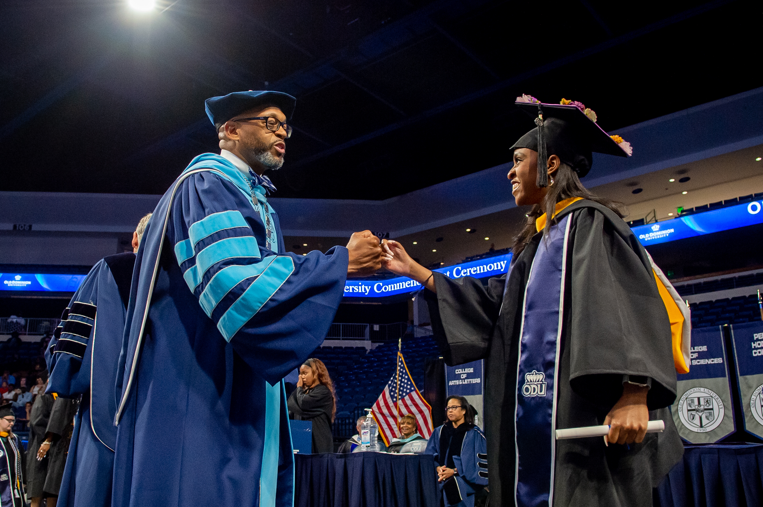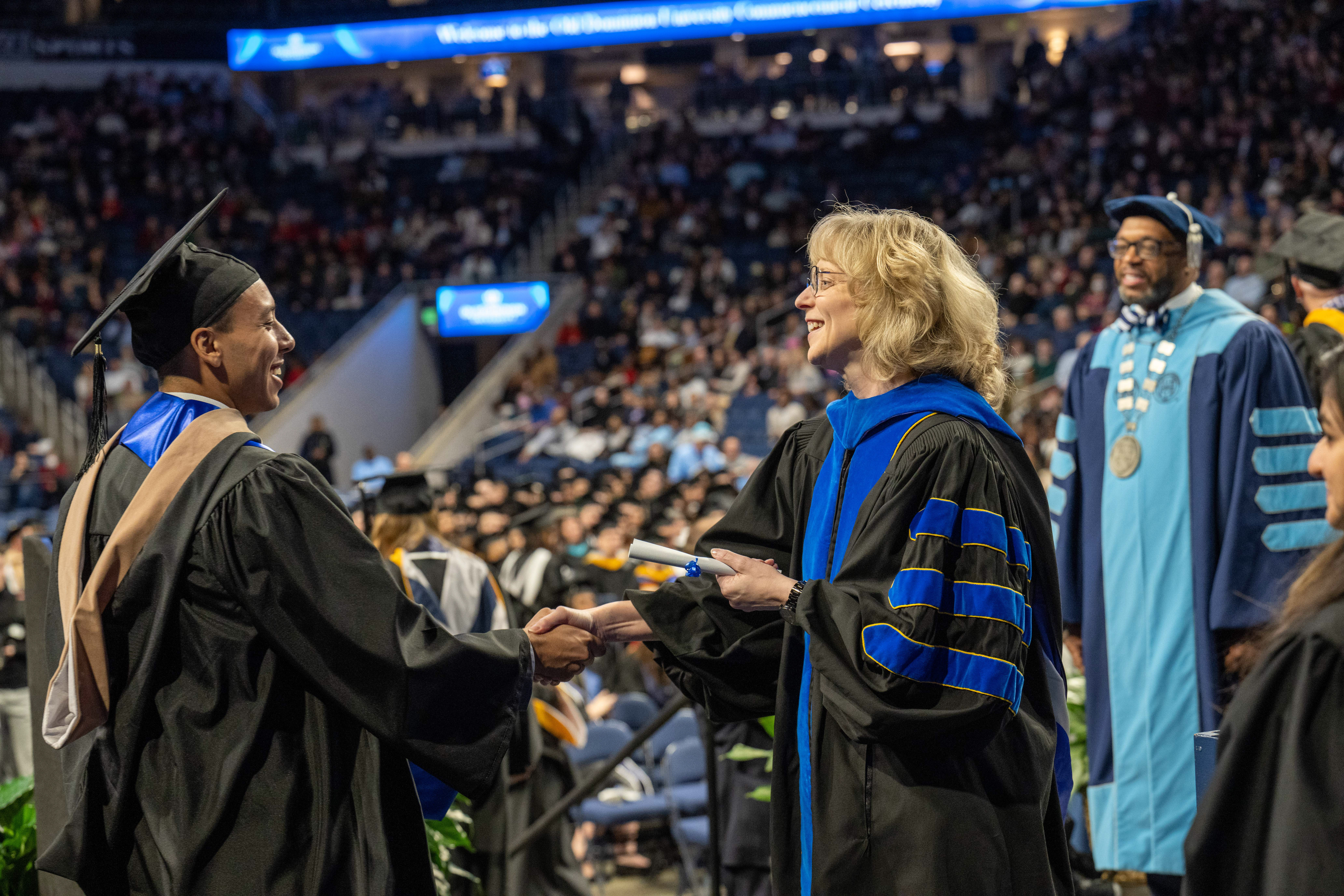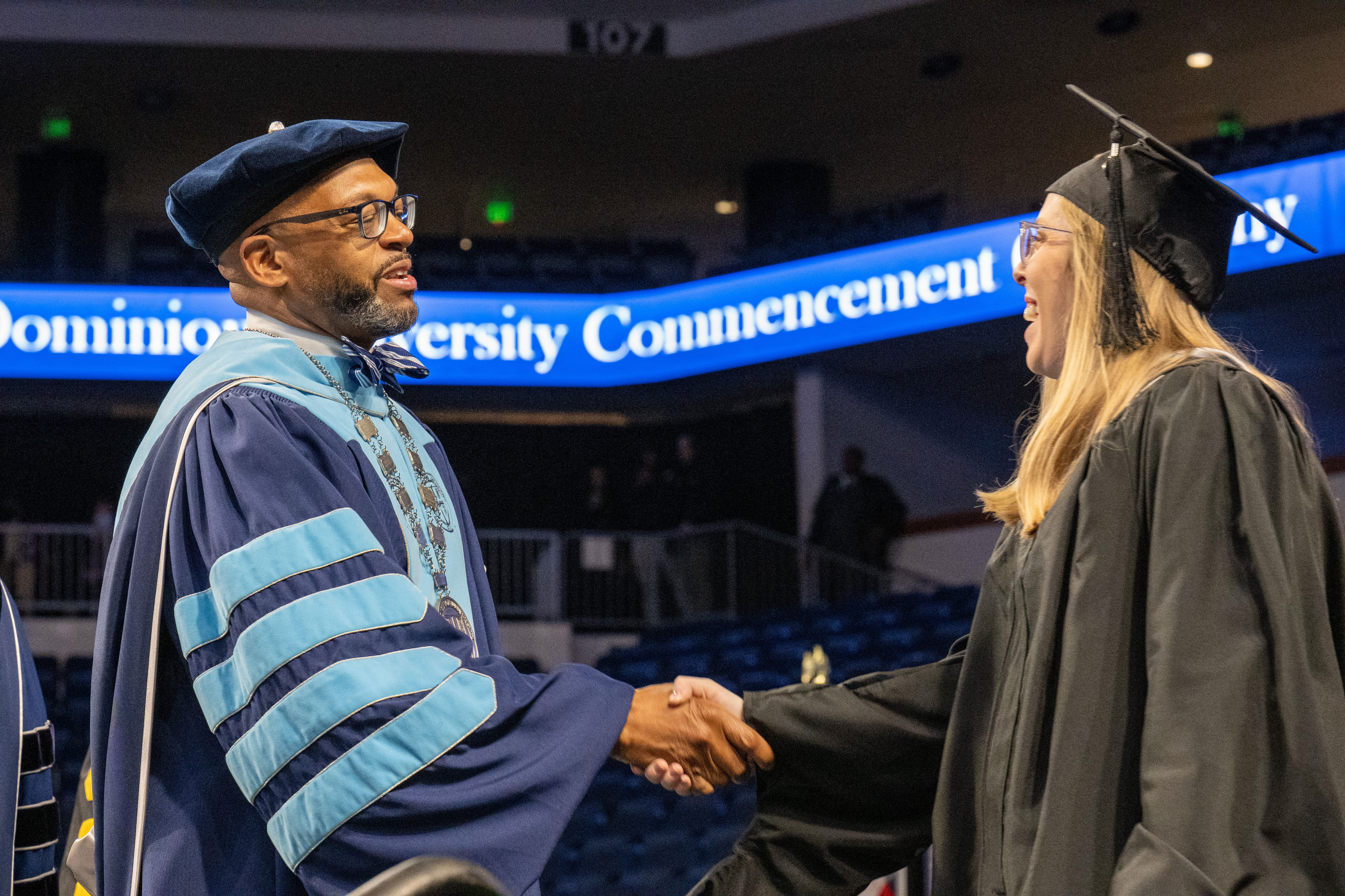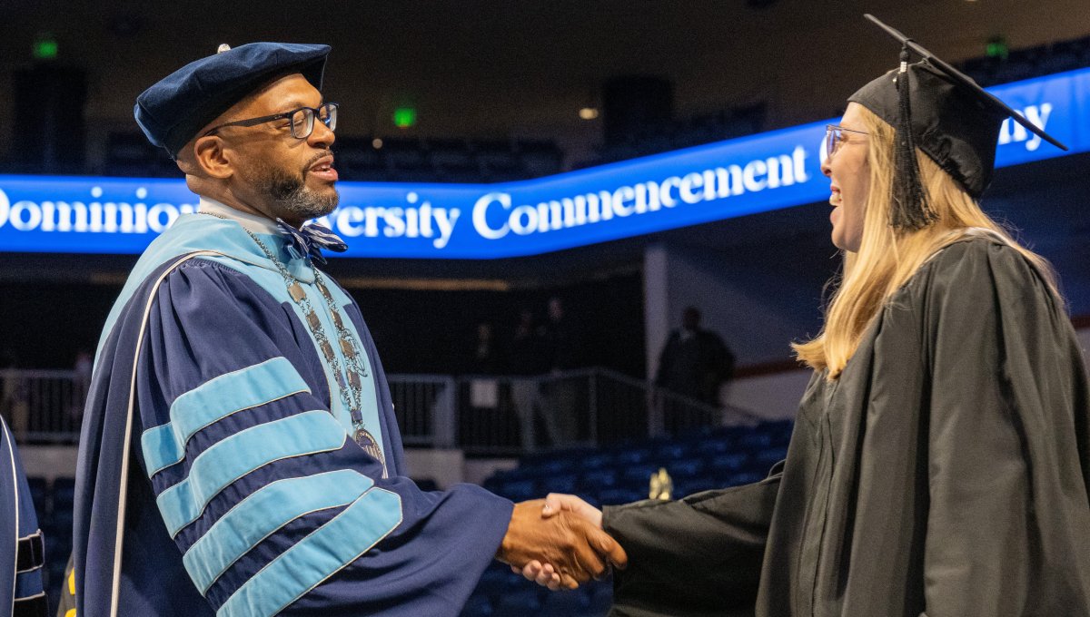 President Brian O. Hemphill, Ph.D., congratulates a student at Old Dominion University's commencement exercises on May 6at Chartway Arena. Photo Chuck Thomas/ODU