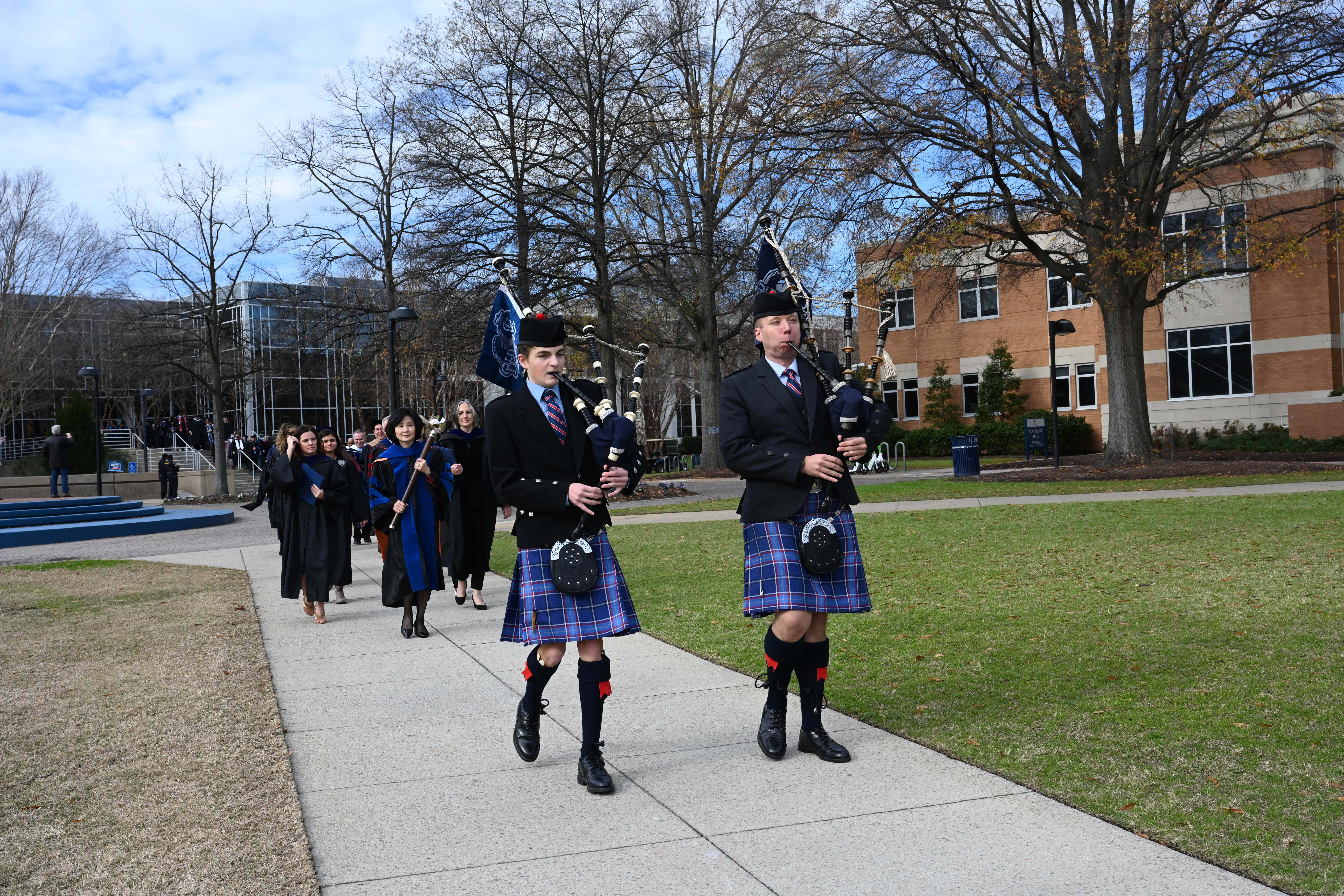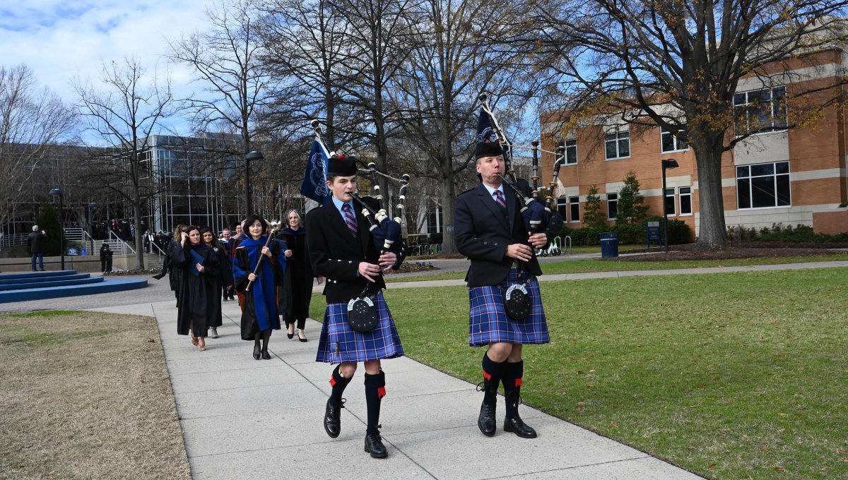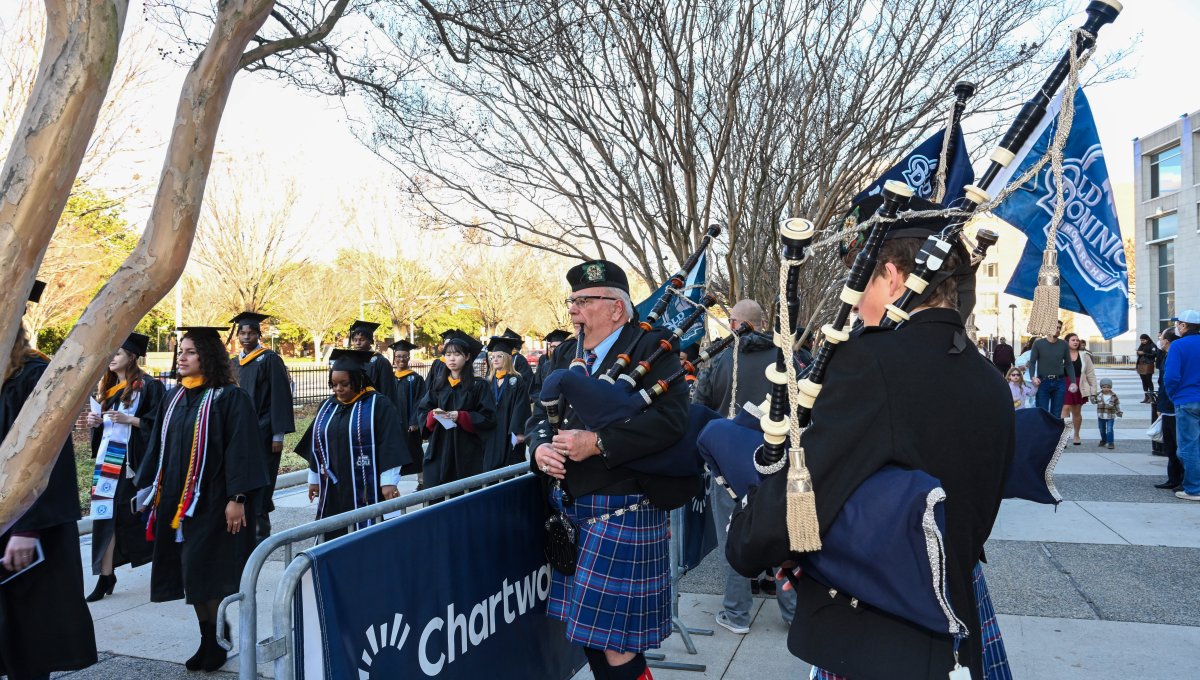 Bagpipers play as they lead graduates across campus to Chartway Arena. Photo Chuck Thomas/ODU