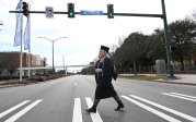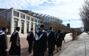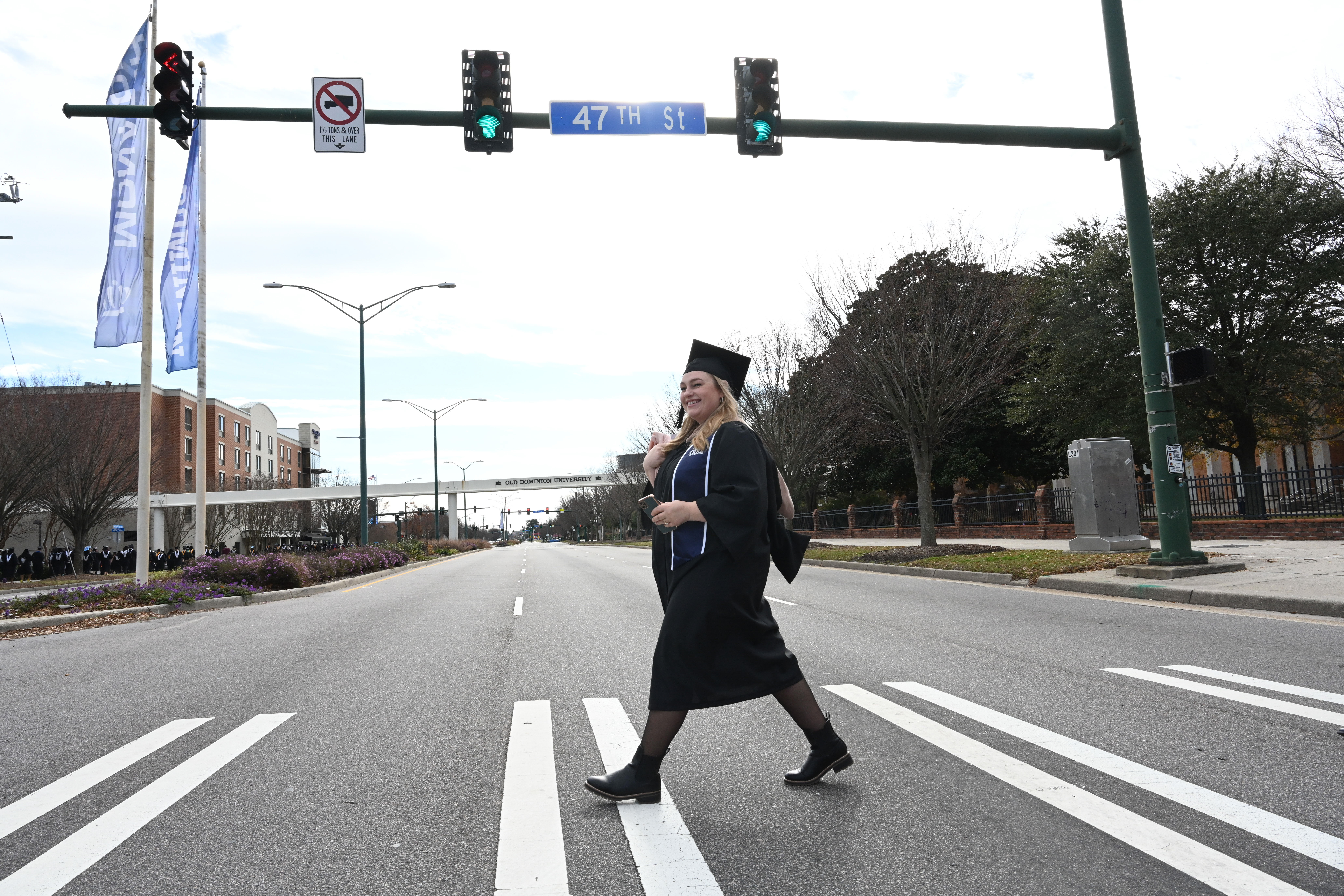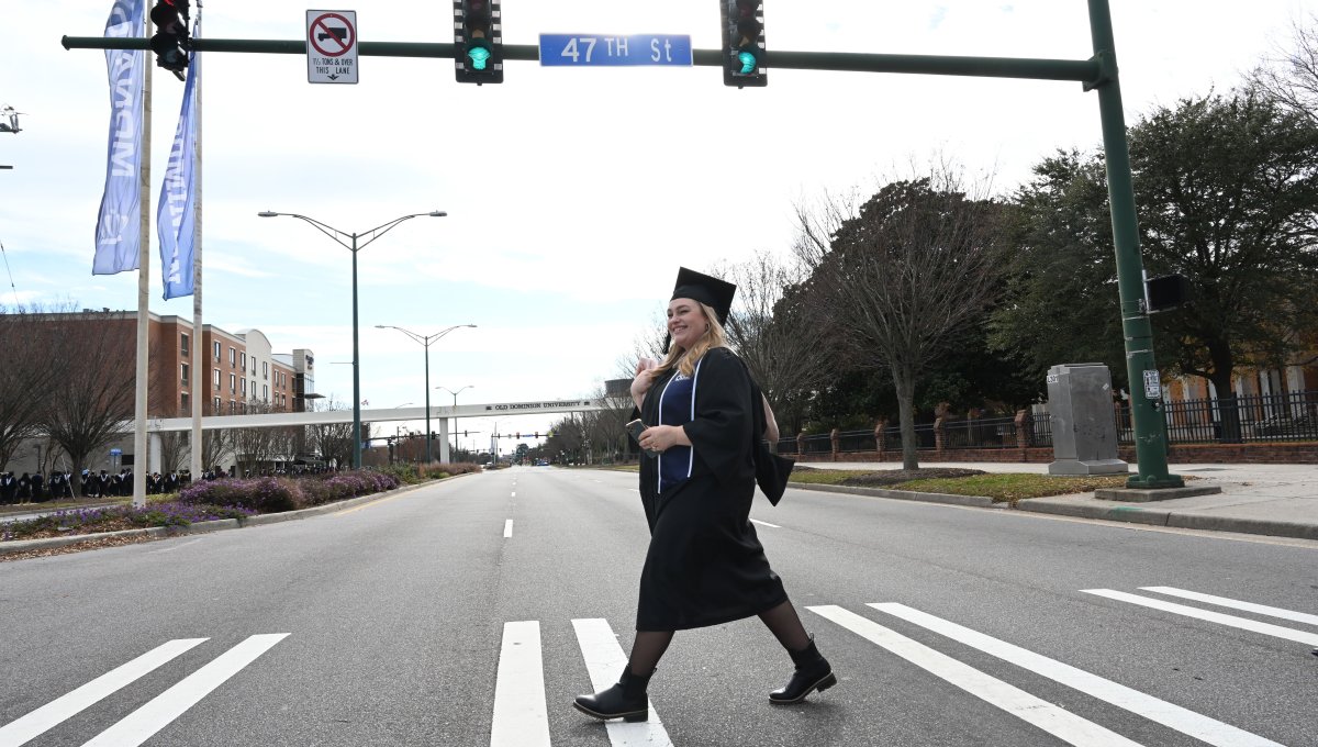 A graduate crosses Hampton Boulevard and processes to Chartway Arena. Photo Chuck Thomas/ODU