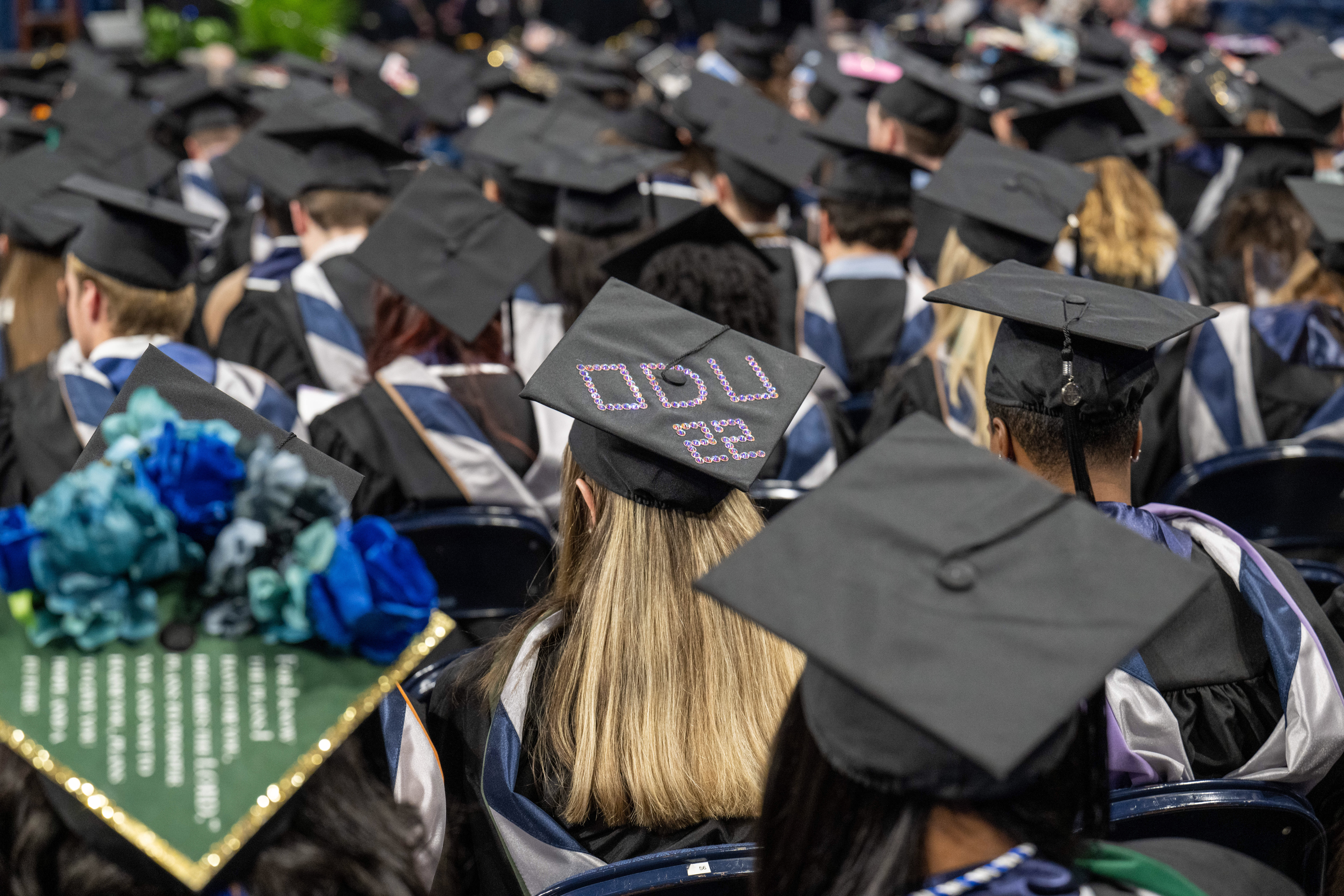 To stand out amid a sea of caps and gowns, some graduating students decorate their mortarboards with messages, images and even 3-D creations. Photo Chuck Thomas/ODU