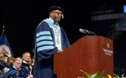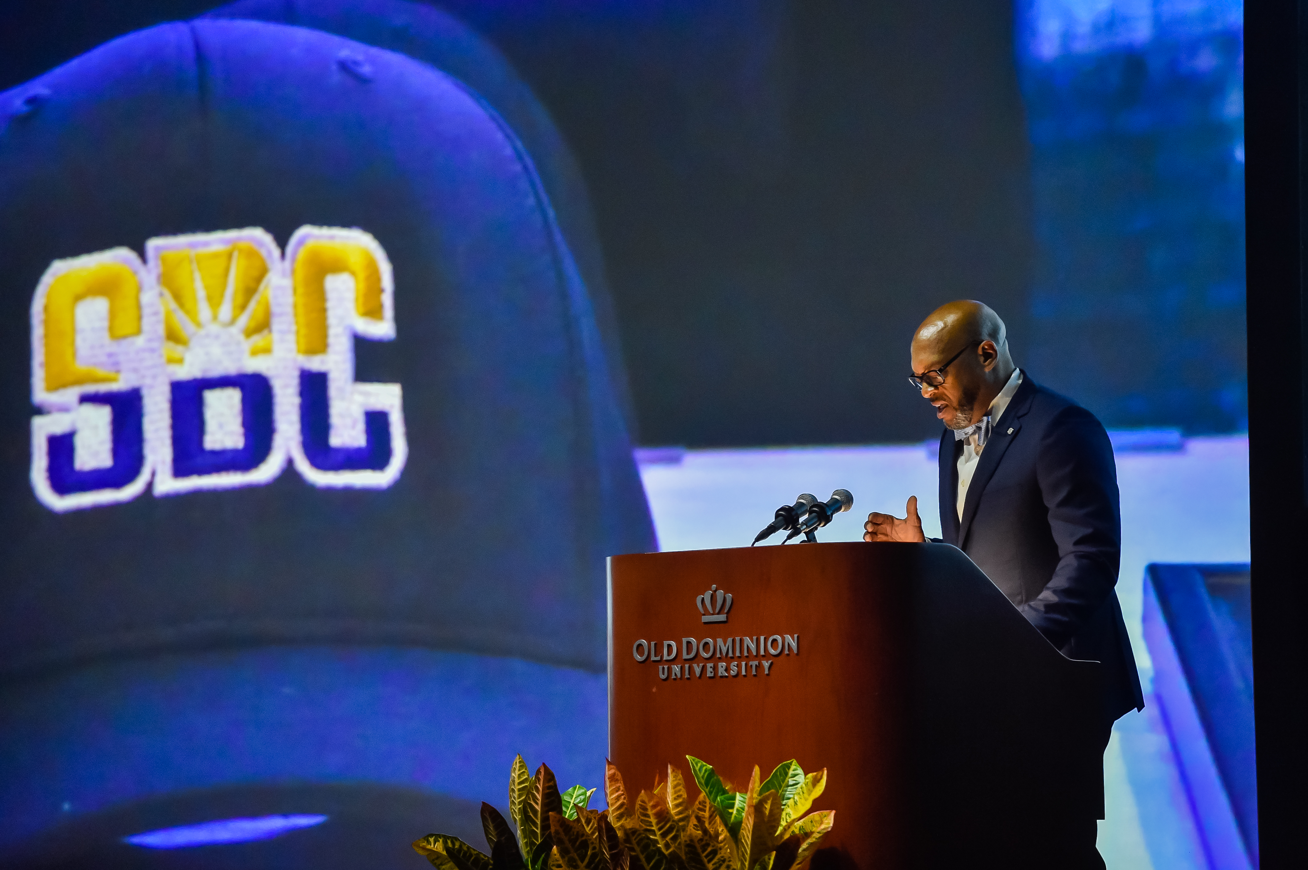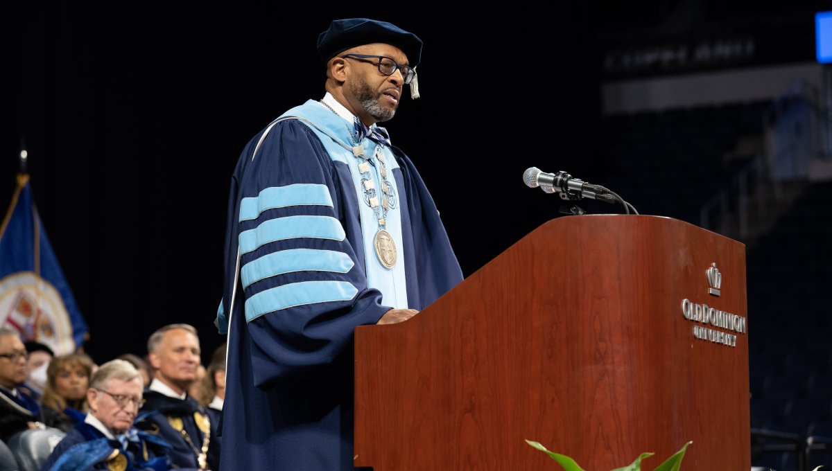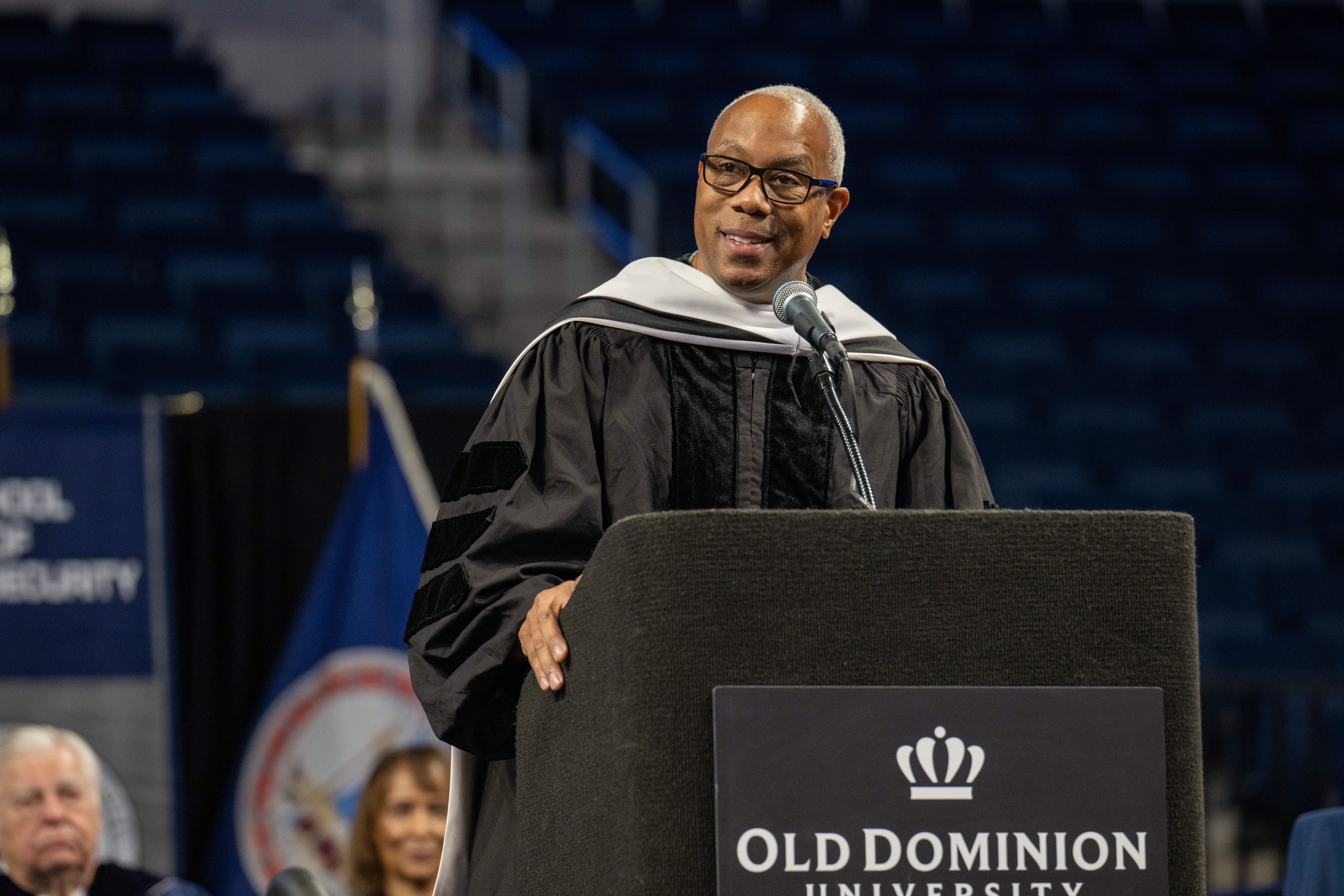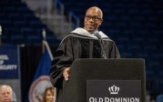 President Brian O. Hemphill Ph.D., speaks at Old Dominion University's commencement exercises May 7 at the Chartway Arena . Photo Chuck Thomas/ODU