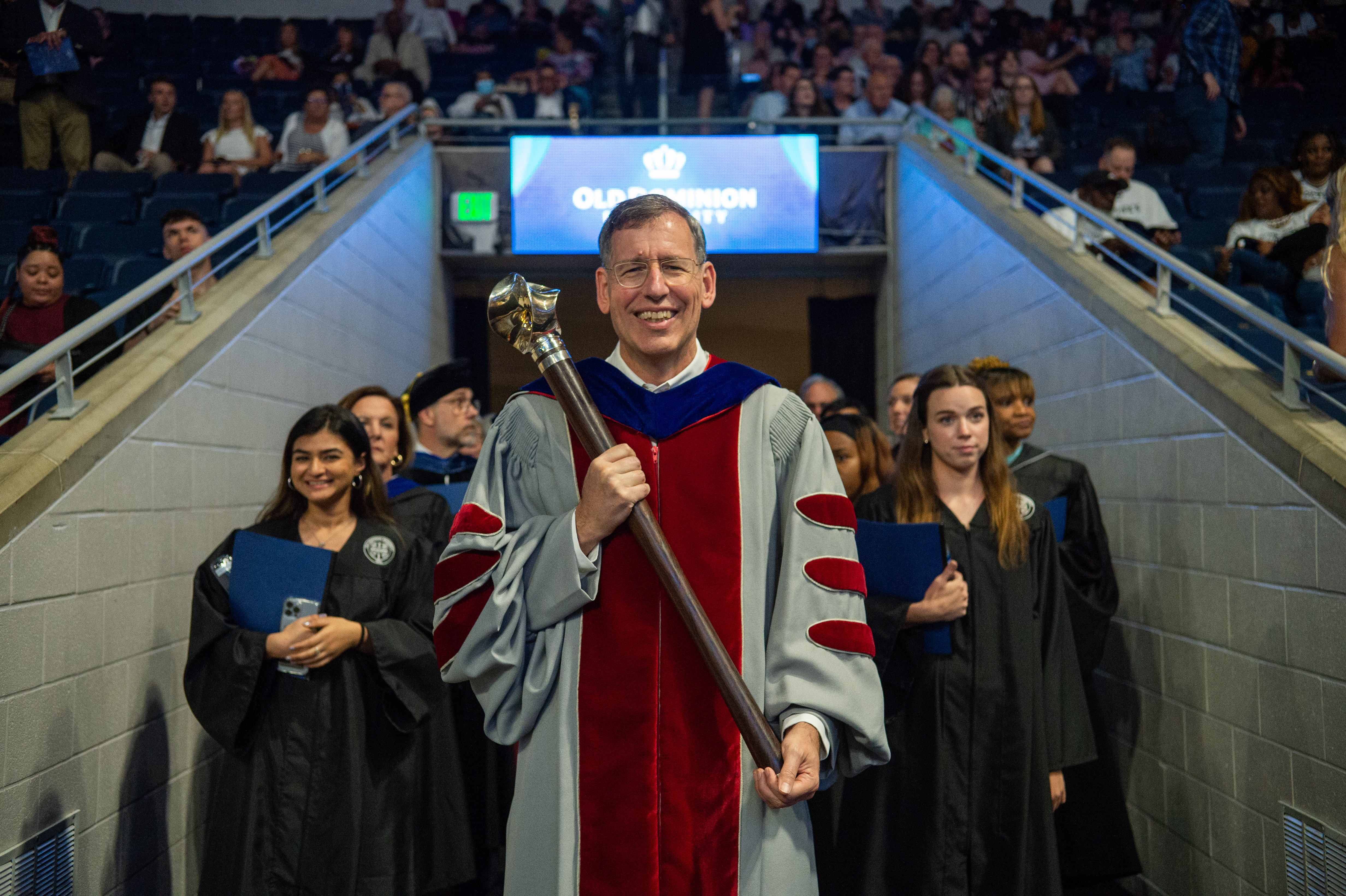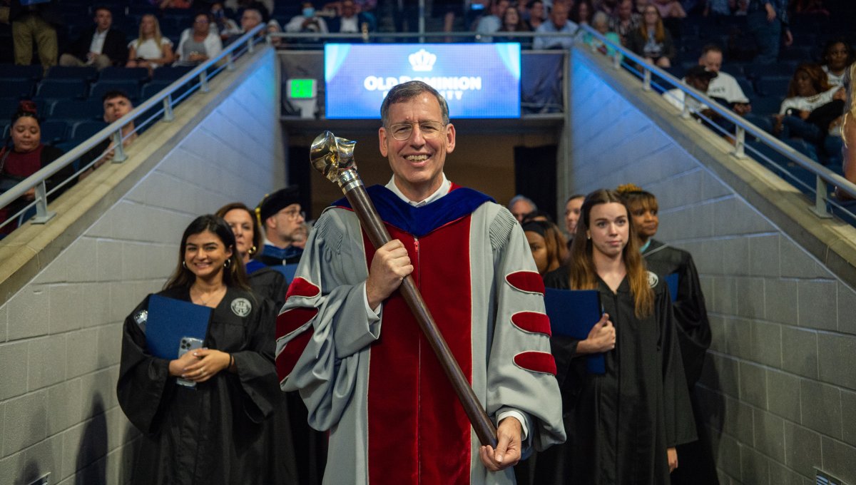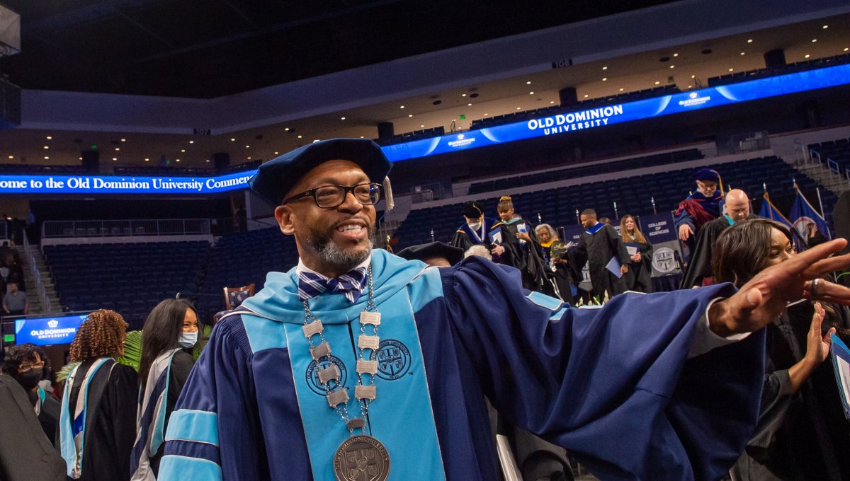 President Brian O. Hemphill, Ph.D., waves to students as he exits the the College of Arts and Letters commencement on May 6. Photo Chuck Thomas/ODU