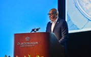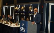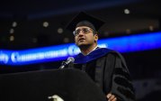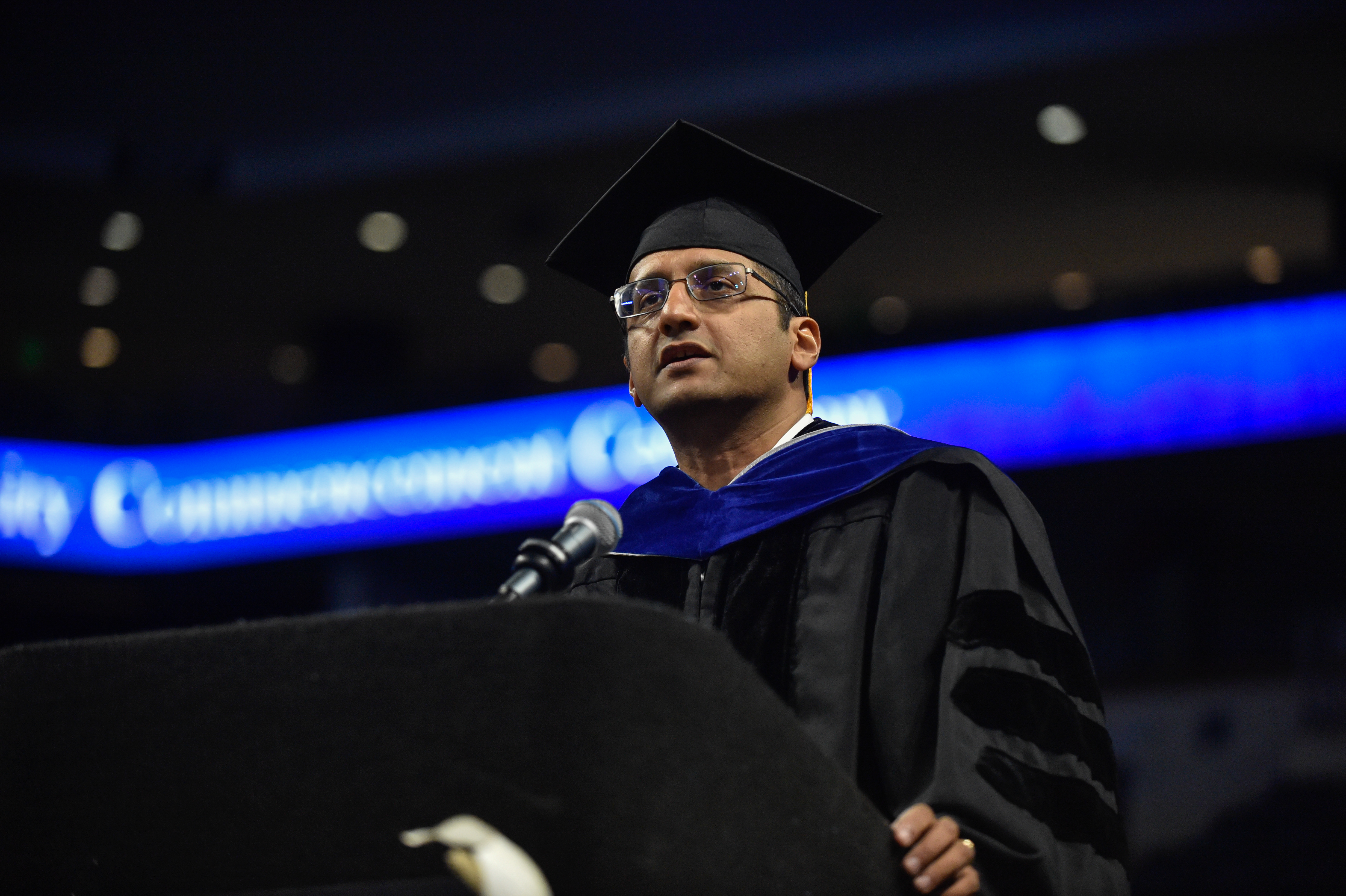 Sachin Shetty, executive director of the Center for Secure and Intelligent Critical Systems at ODU's Virginia Modeling, Analysis and Simulation Center, speaks at the advanced degree ceremony Friday evening at the Chartway Arena. Photo Chuck Thomas/ODU