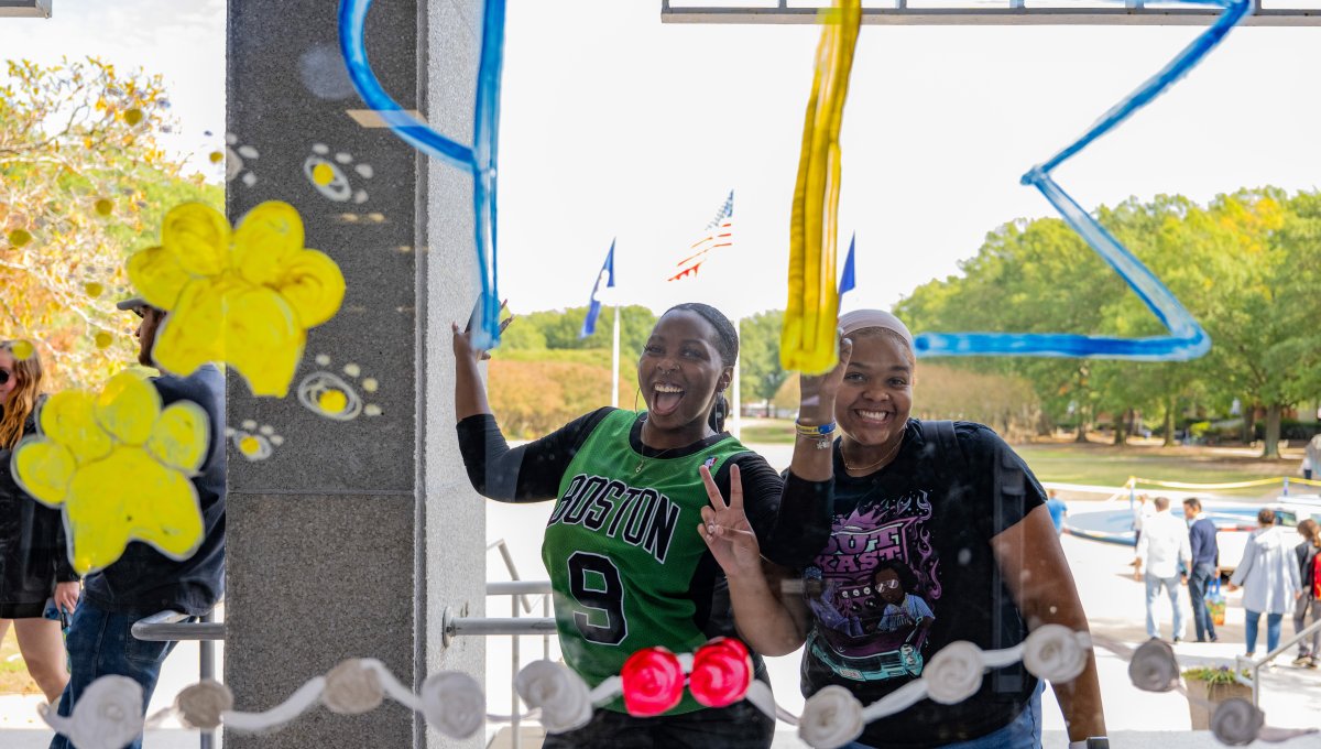 Mikaela Jefferson (left) and Ayuna Hillman take a break from painting to pose for a photo. Photo Chuck Thomas/ODU