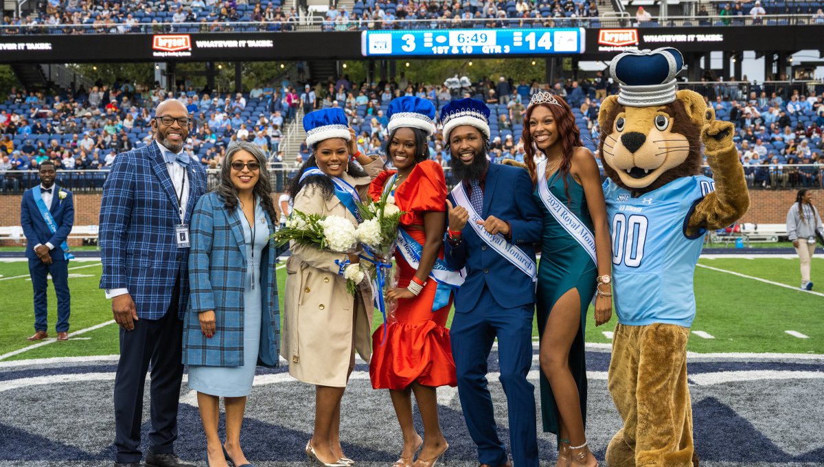 From left, President Brian O. Hemphill, Ph.D.; First Lady Marisela Rosas Hemphill, Ph.D.; Tamaya Mozell; London Hall; Demetre South; Caitlyn Kidd; and Big Blue. Mozell and Hall are the 2022 Royal Court selections. Photo Nicholas Clark/ODU