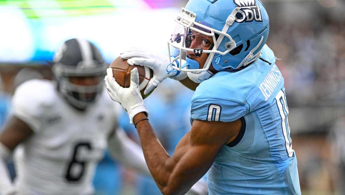 Wide receiver Ali Jennings catches a 22-yard pass from Hayden Wolff and runs it in for a touchdown. Photo Chuck Thomas/ODU