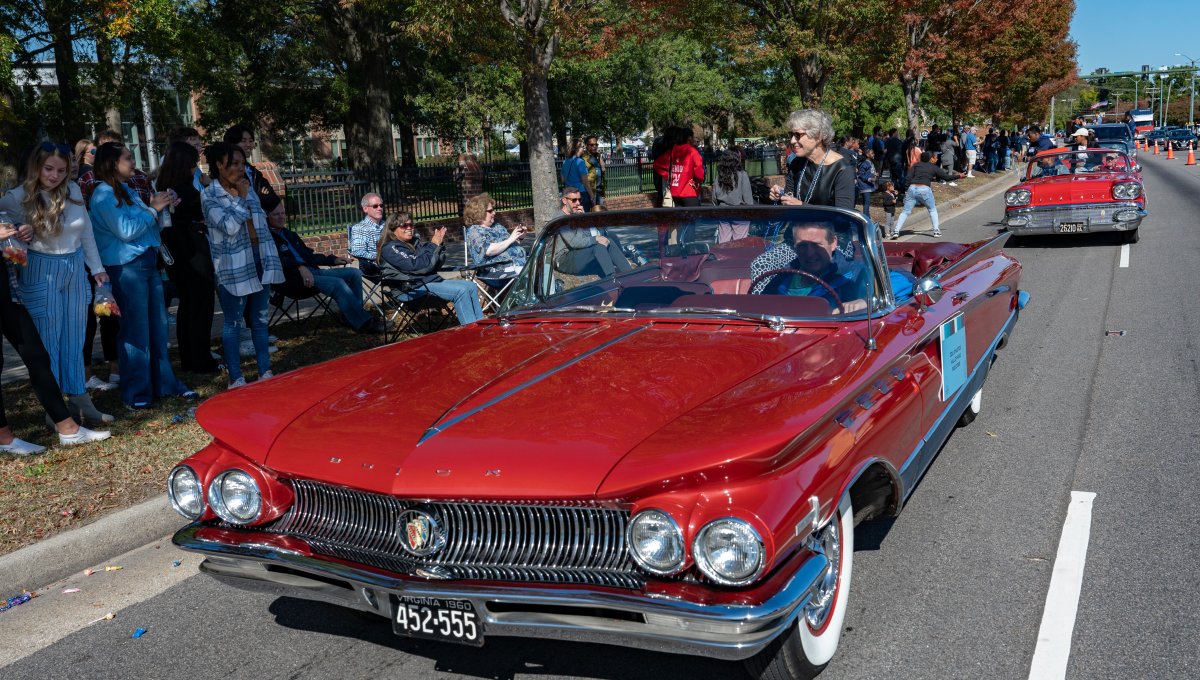 Debbie White, one of five inductees into ODU’s Sports Hall of Fame, rides in a 1960 Buick convertible during the Homecoming parade. Photo Chuck Thomas/ODU