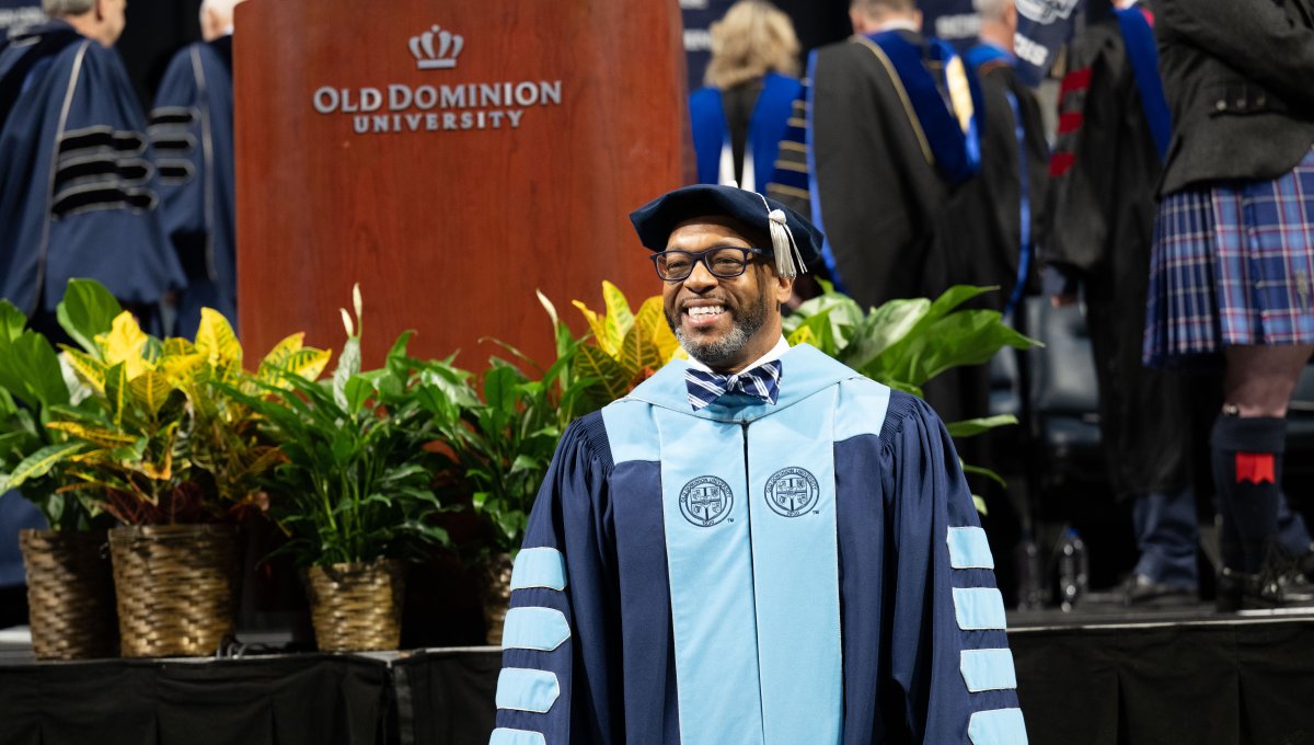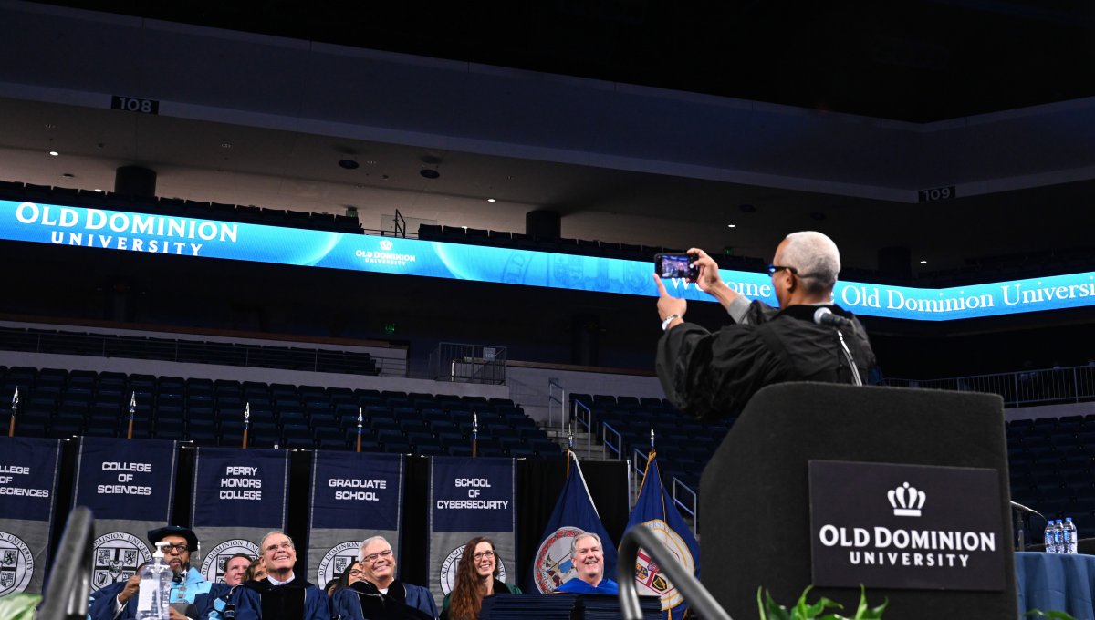 ESPN SportsCenter anchor Jay Harris takes a selfie at Old Dominion University’s commencement exercises on Dec. 17. Photo Chuck Thomas/ODU