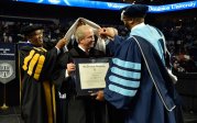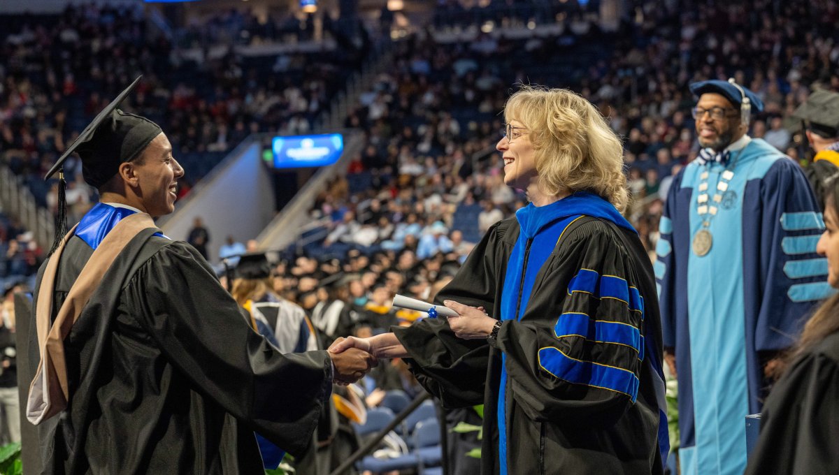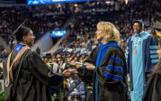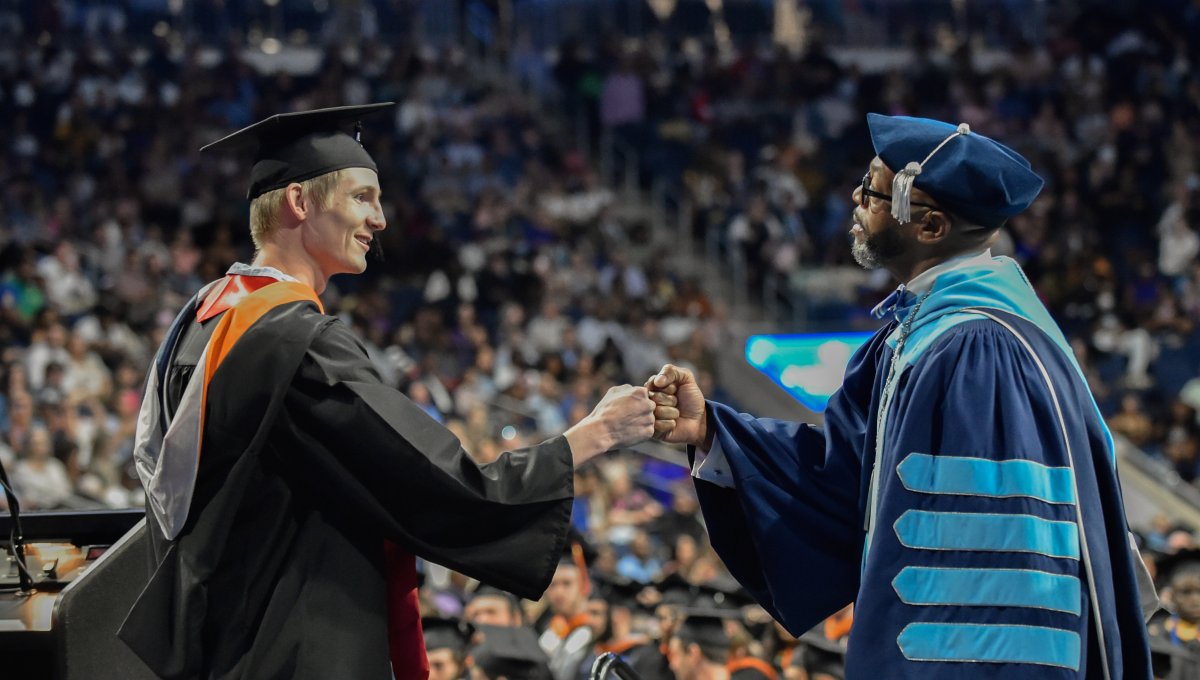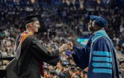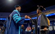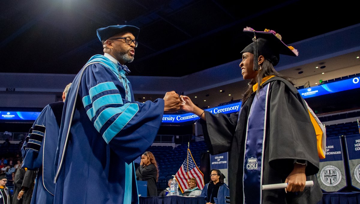 President Brian O. Hemphill, Ph.D., congratulates a student at Old Dominion University’s commencement exercises on Dec. 17 at Chartway Arena. Photo Chuck Thomas/ODU