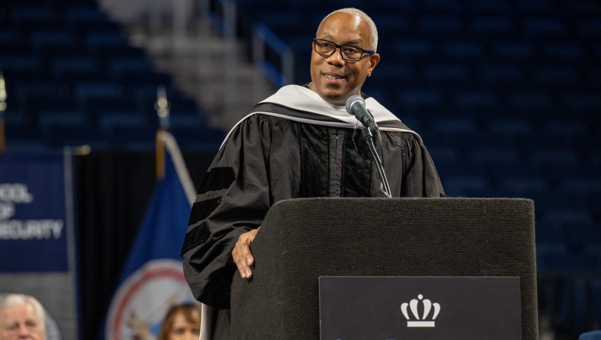 ESPN SportsCenter anchor Jay Harris speaks at Old Dominion University’s commencement exercises on Dec. 17. Photo Chuck Thomas/ODU