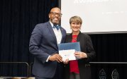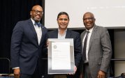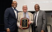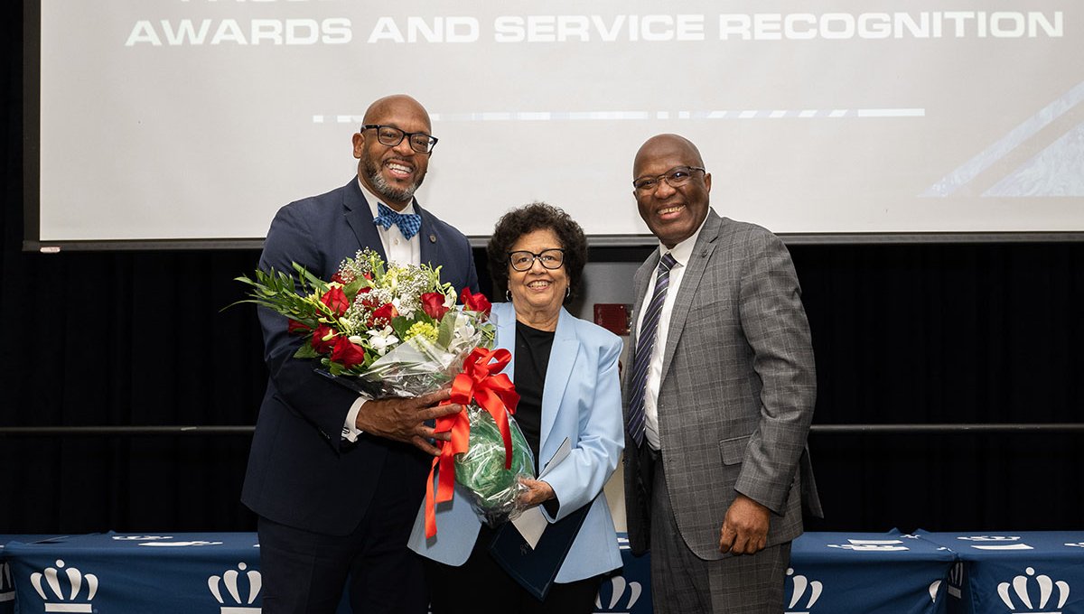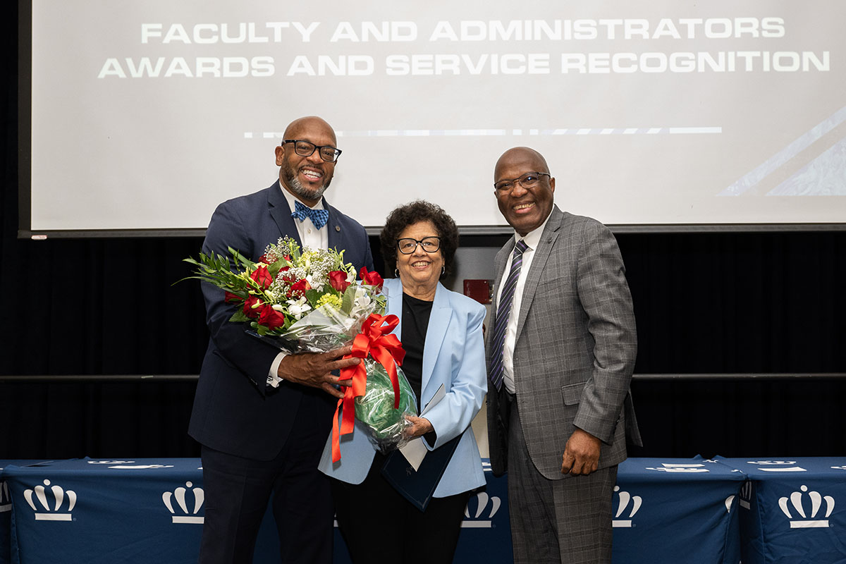 Nina Brown, a Darden College of Education professor, poses with President Brian O. Hemphill, Ph.D., and Austin Agho, provost and vice president of academic affairs. She received a standing ovation as she was recognized for 55 years of service at the Faculty and Administrators Awards and Service Recognition Dinner, which was held April 10 in the Big Blue Room at the Ted Constant Convocation Center. Photo Chuck Thomas/ODU