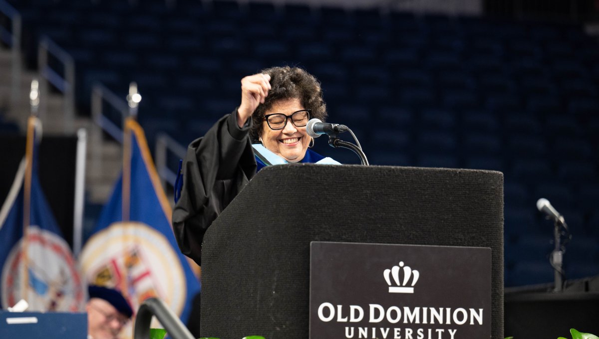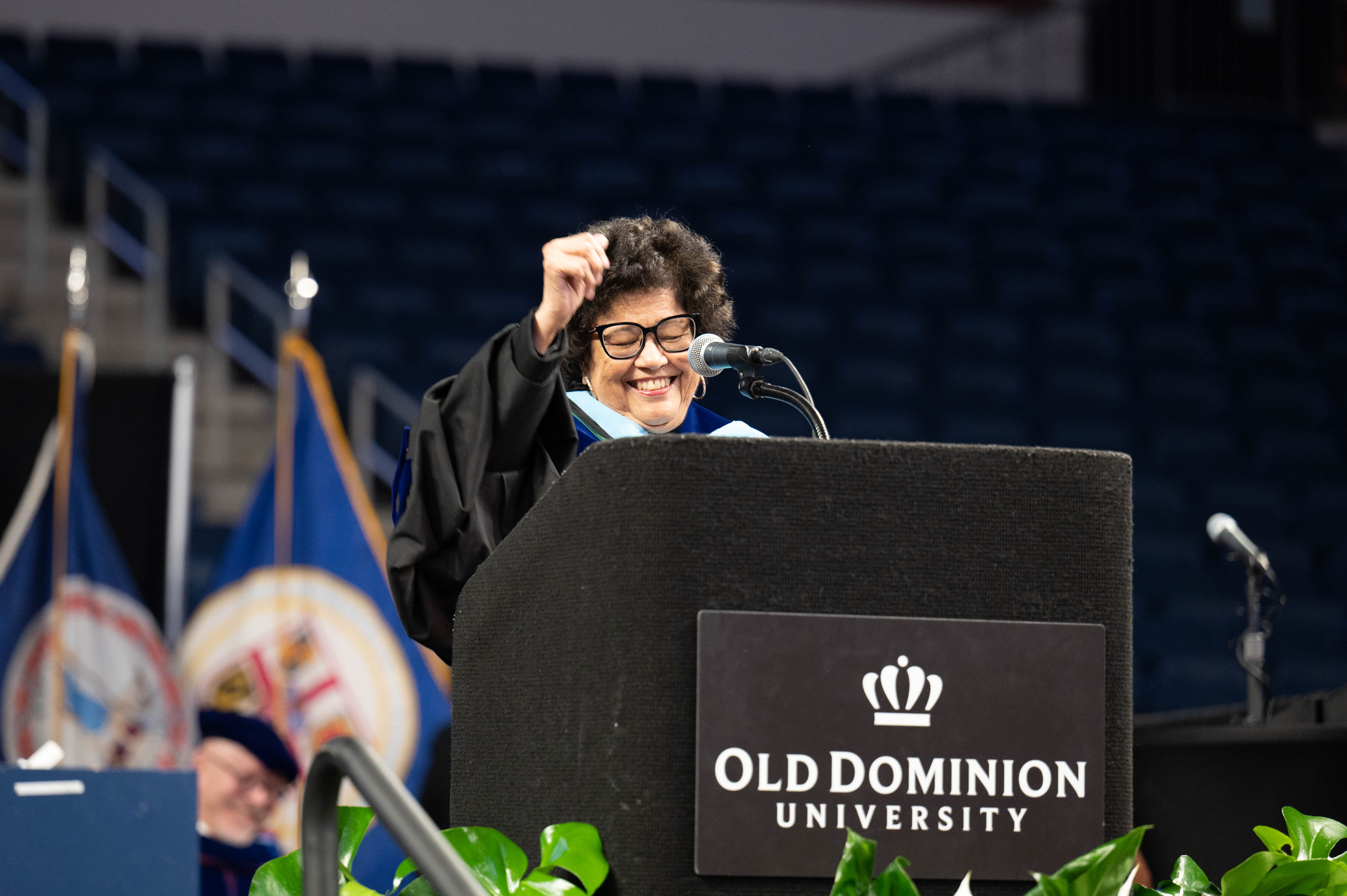 Professor Nina Brown delivers remarks at the advanced-degree commencement ceremony at Chartway Arena on May 5, 2023. Photo Chuck Thomas/ODU