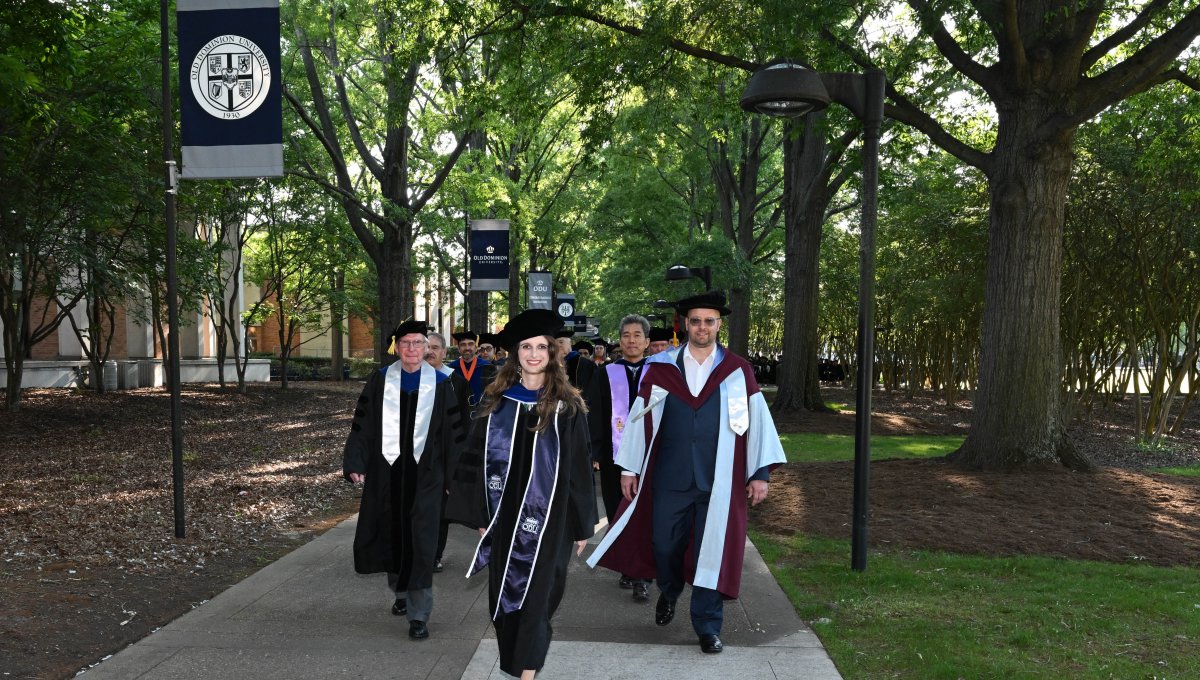 Advanced-degree students process from Kaufman Mall to Chartway Arena. Photo Chuck Thomas/ODU