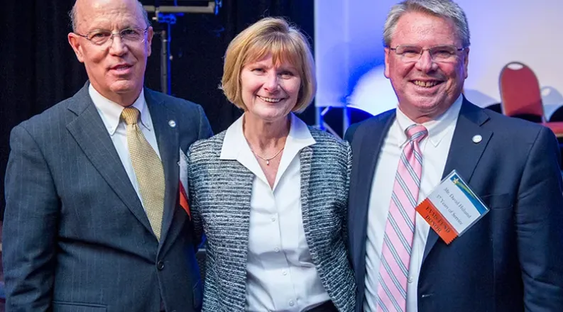 The ceremony marked a milestone for the school: the first employee to achieve 45 years of continuous service. Sandy Huband, Administrator for Physiological Services, joined EVMS before the school opened its doors in 1973. She is pictured above with President Homan and with her husband, David, also and EVMS employee. Look here for the entire list of full-time faculty and staff honored for service milestones and here for more photographs from the event.