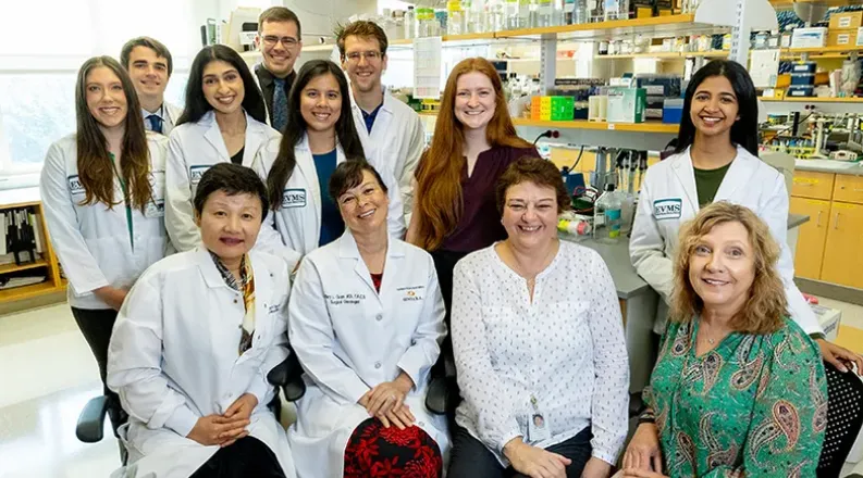 Pictured at top: Dr. Amy Tang, seated left, with Dr. Mary Guye; Sentara breast surgeon; Dr. Billur Samli, Sentara breast clinical pathologist; and Patti Bassett, Sentara Pathology laboratory manager. Standing are EVMS MD and PhD students Claire Piatak, Zachary Bouker, Fatima Chaudhry, Jonathan Baker, Nikki Drake and Daniel McWilliams; Darian Hyde, Sentara Pathology technician; and MD student Shoba Abraham. Not present for the photo were Cindy Allen and Dr. Richard Hoefer from Sentara Health Research Center, and Dr. Harry Bear at VCU Massey Cancer Center in Richmond.