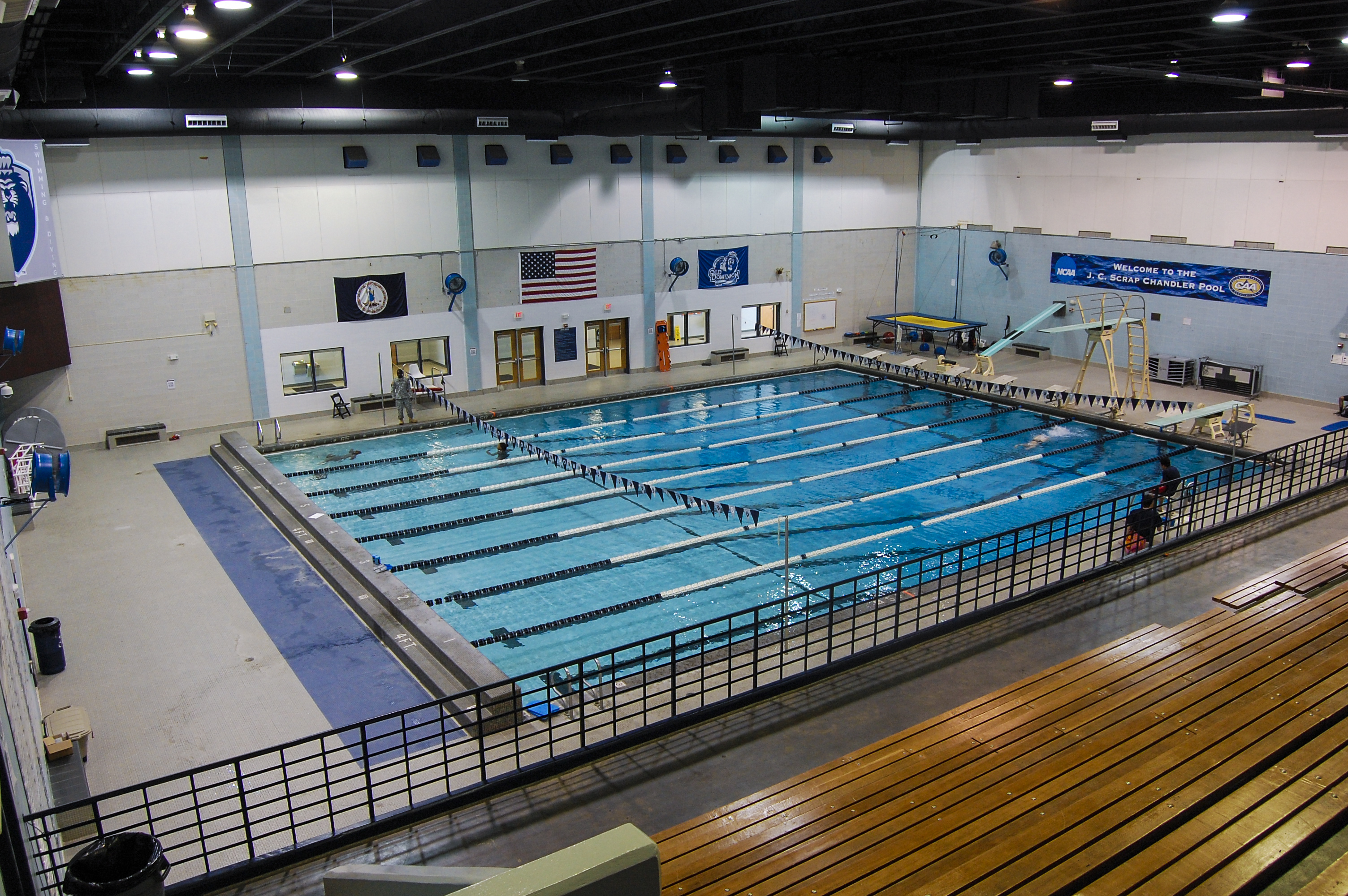 The J.C. Scrap Chandler Pool, located inside the ODU Student Recreation and Well-Being Center, is an 8 lane, 25 yard indoor pool with depths between 4 and 15 feet. The temperature is set between 78-80 degrees because it is a competition pool. Locker and shower facilities are available.