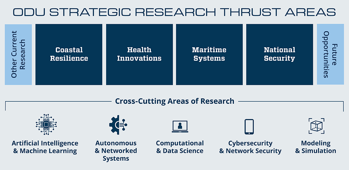 Old Dominion University is a forward-focused public research institution, deeply committed to supporting the vast array of faculty research, scholarship, and creative activity. As part of our strategic vision to achieve national and global impact, ODU has identified four key research thrust areas—Coastal Resilience, Health Innovations, Maritime Systems, and National Security—each grounded in existing faculty expertise and responsive to local, regional, and national priorities.
