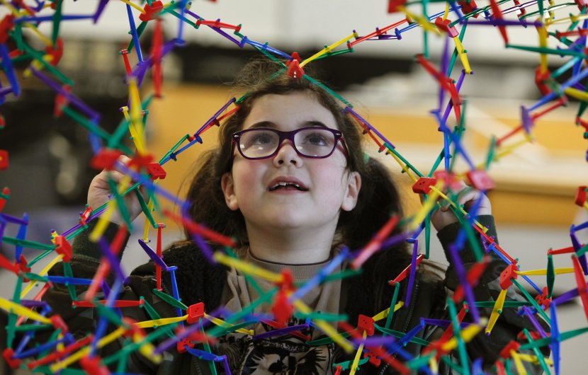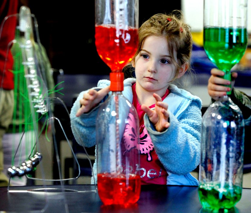 ODU Physics Open House Seven-year-old Scarlett Clark is amazed by this Hoberman Sphere which proves how volume and density increase as it expands. Photo David B. Hollingsworth/ODU