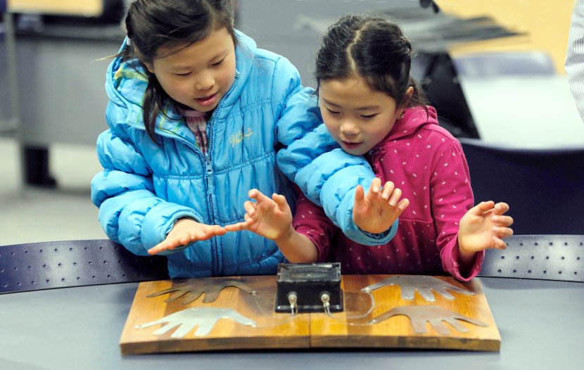ODU Physics Open House Anna (left) and Elizabeth Ying are about to become a human battery. Photo David B. Hollingsworth/ODU