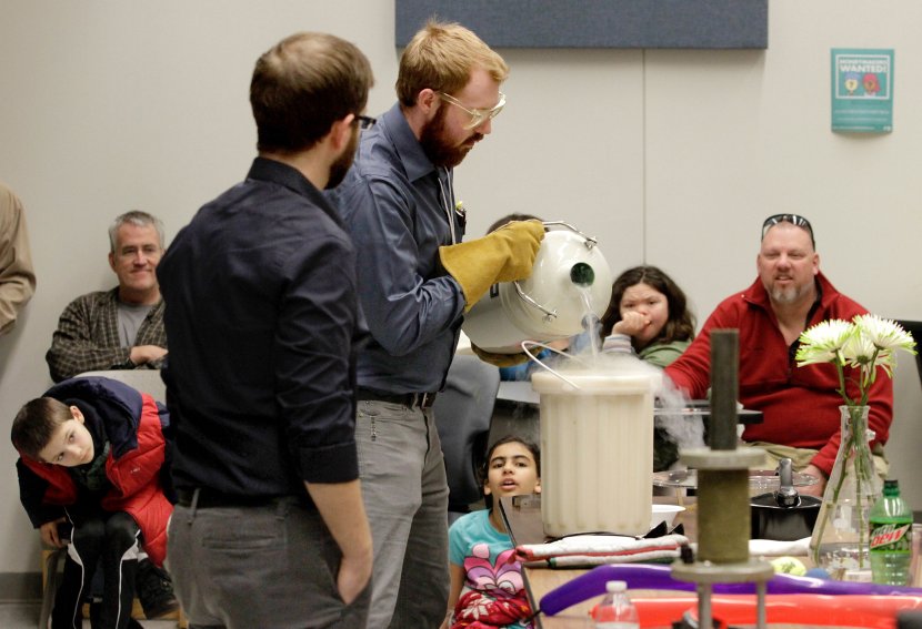 ODU Physics Open House Physics Lecturer Perry Nerem pours liquid nitrogen into a dewar as he prepares one of his demonstrations. Photo David B. Hollingsworth/ODU