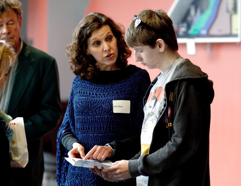 ODU Physics Open House Lisa Okun, operations manager for the physics department, helps Carl Chalk find his way to the physics open house activities. Photo David B. Hollingsworth/ODU