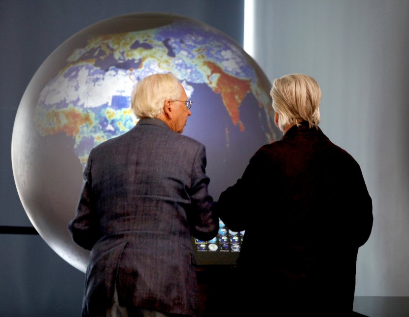 ODU Physics Open House The Omniglobe, which allows viewers to use a touchscreen to view maps and ocean currents, caught the eye of attendees. Photo David B Hollingsworth/ODU