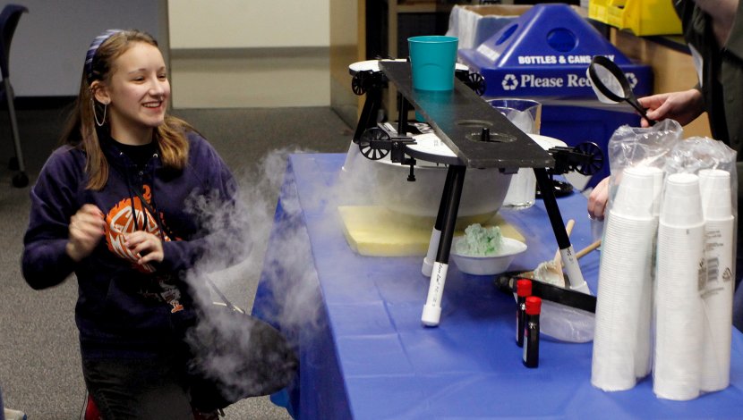 ODU Physics Open House Sarah Morrow, a self-described physics nerd, gets a close look as an ODU student makes liquid nitrogen ice cream. Photo David B. Hollingsworth/ODU