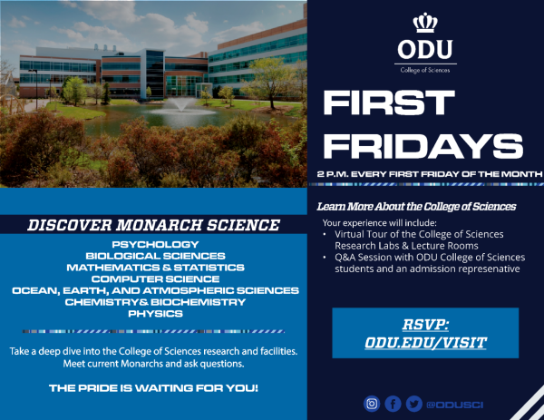 Join us on select Fridays of every month with tours beginning at 2:00 p.m. Take a deep dive into College of Sciences research and facilities, and learn more about our undergraduate programs offered at Old Dominion University.