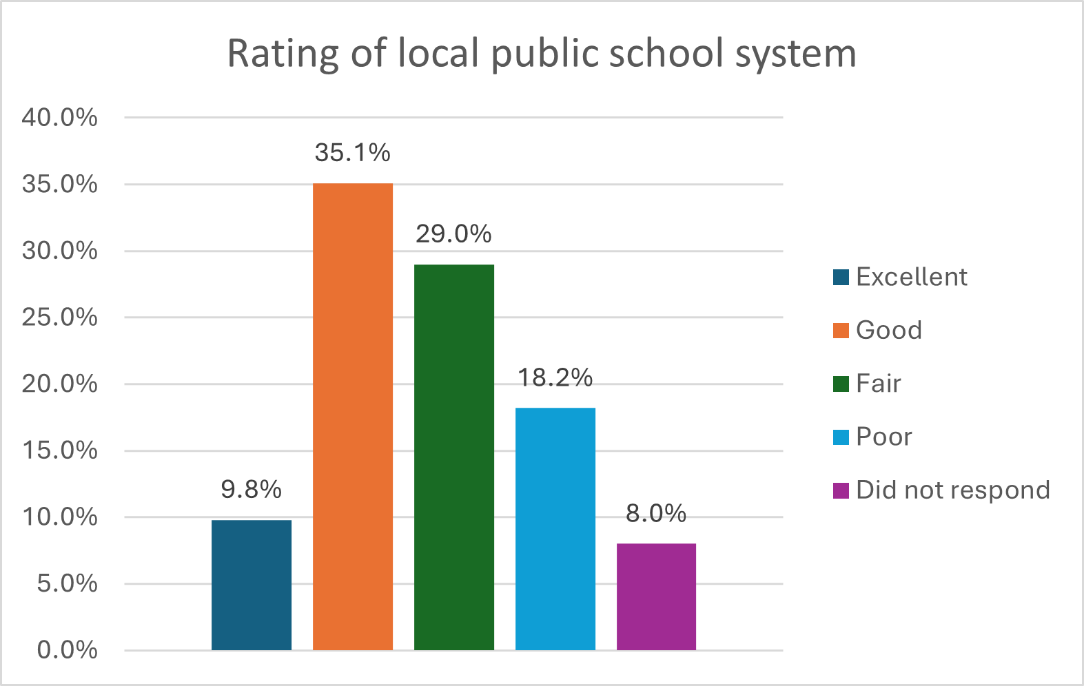 The majority of respondents did not have school-aged children. Only 22.5% of respondents reported having school-aged children who attend public school, while 4.8% attend private school and 1.1% are home-schooled. Regardless of whether respondents had school-aged children or if they had children in public schools, all residents surveyed were asked to rate the quality of their local public school system. About 10% reported that their public school system was excellent and another third (35.1%) reported their school system was good. Still, 29% rated their local public school as fair and another 18.2% rated it as poor.