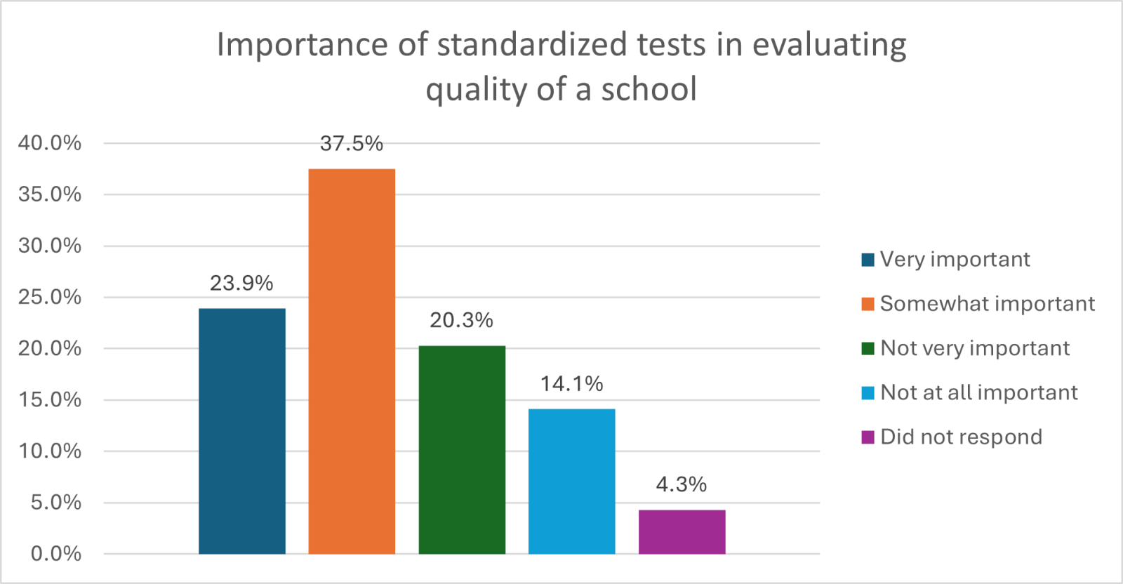 Interestingly, respondents with school-aged children were less likely to think that standardized tests were either very or somewhat important compared to those without school-aged children. Although the difference between the two groups was not significant, almost two-thirds of those without school-aged children (65.9%) believed that standardized tests were very or somewhat important, compared to 59.4% of those with school-aged children.