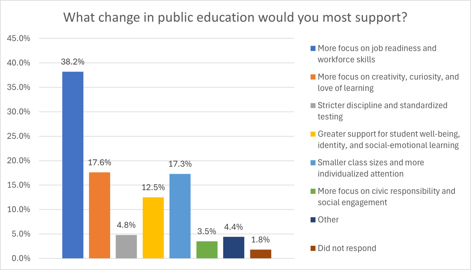 We also asked residents of Hampton Roads what change in education they would most support. Thirty-eight percent of respondents indicated support for a greater focus on job readiness and workforce skills, while 17.6% indicated more focus on creativity, curiosity, and love of learning would be the change in education they would most support. Seventeen percent of respondents would most support smaller class sizes and more individualized attention, and 12.5% wanted greater support for student well-being, identity, and social-emotional development.