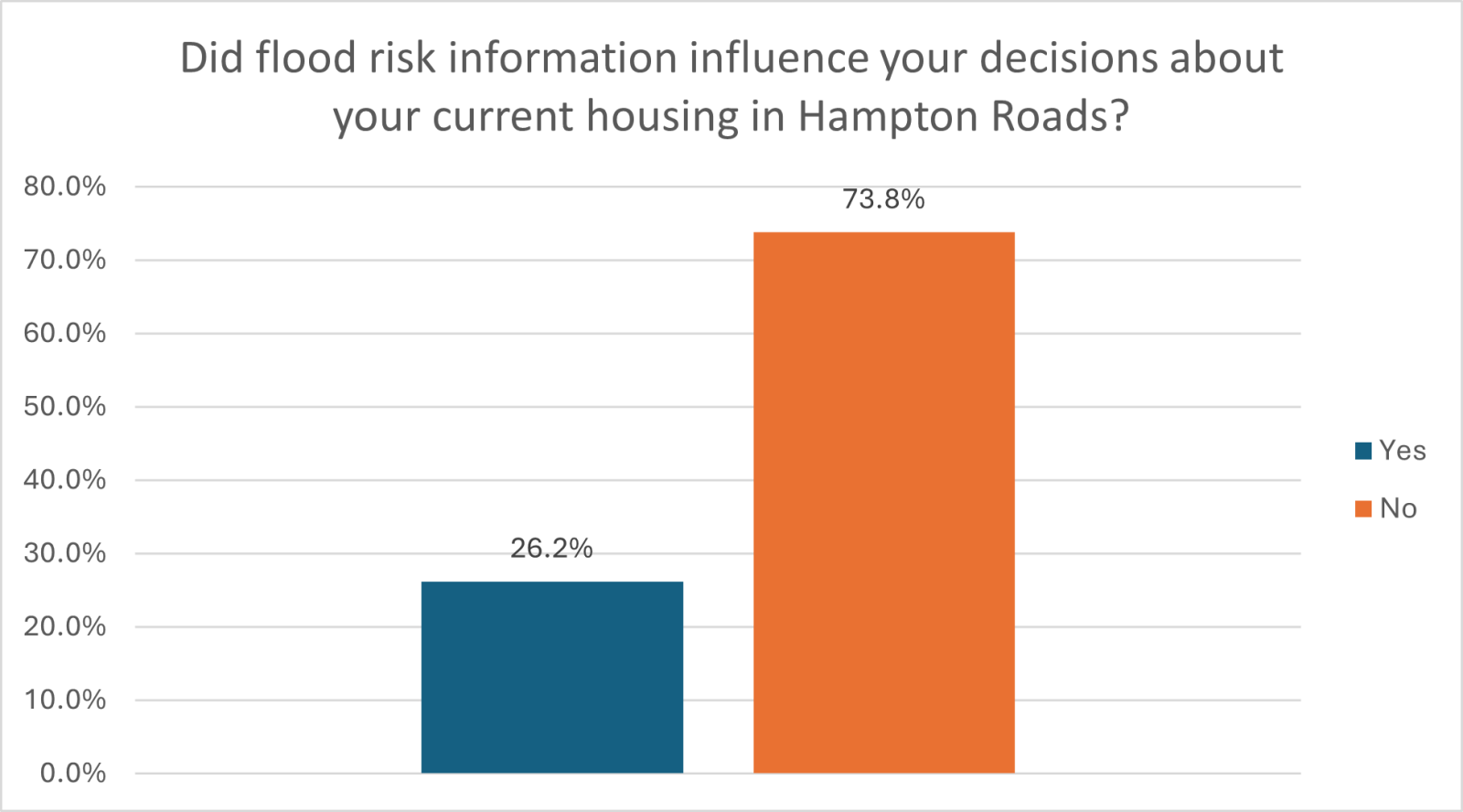 Residents were asked if flood risk information influenced their decisions about their current housing in Hampton Roads and the majority of residents (73.8%) said the flood risk information did not influence their decisions. Of the respondents who indicated they were influenced by the flood risk information, 62.8% believe flood risks significantly influenced their choice of neighborhood, 37.2% were significantly influenced whether to buy or rent their home and 21.3% reported that flood risks influenced some other aspects of their housing decision. Of those respondents who reported they were not influenced by flood risk information, 56% said they were aware of flood risk information, but that information did not influence their current housing decision and 43.6% were unaware of any flood risk information before making a decision about their current housing.