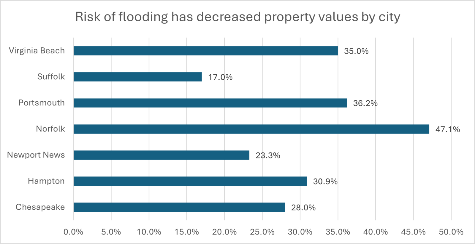 Hampton Roads residents were also asked about the effects of flood risk on property values in their area. Over half of respondents (57.7%) reported that the flood risk has had no impact on property values. More than a quarter of respondents (27%) reported a somewhat decrease in property values in their area and 5.7% reported greatly decreased values in their area.