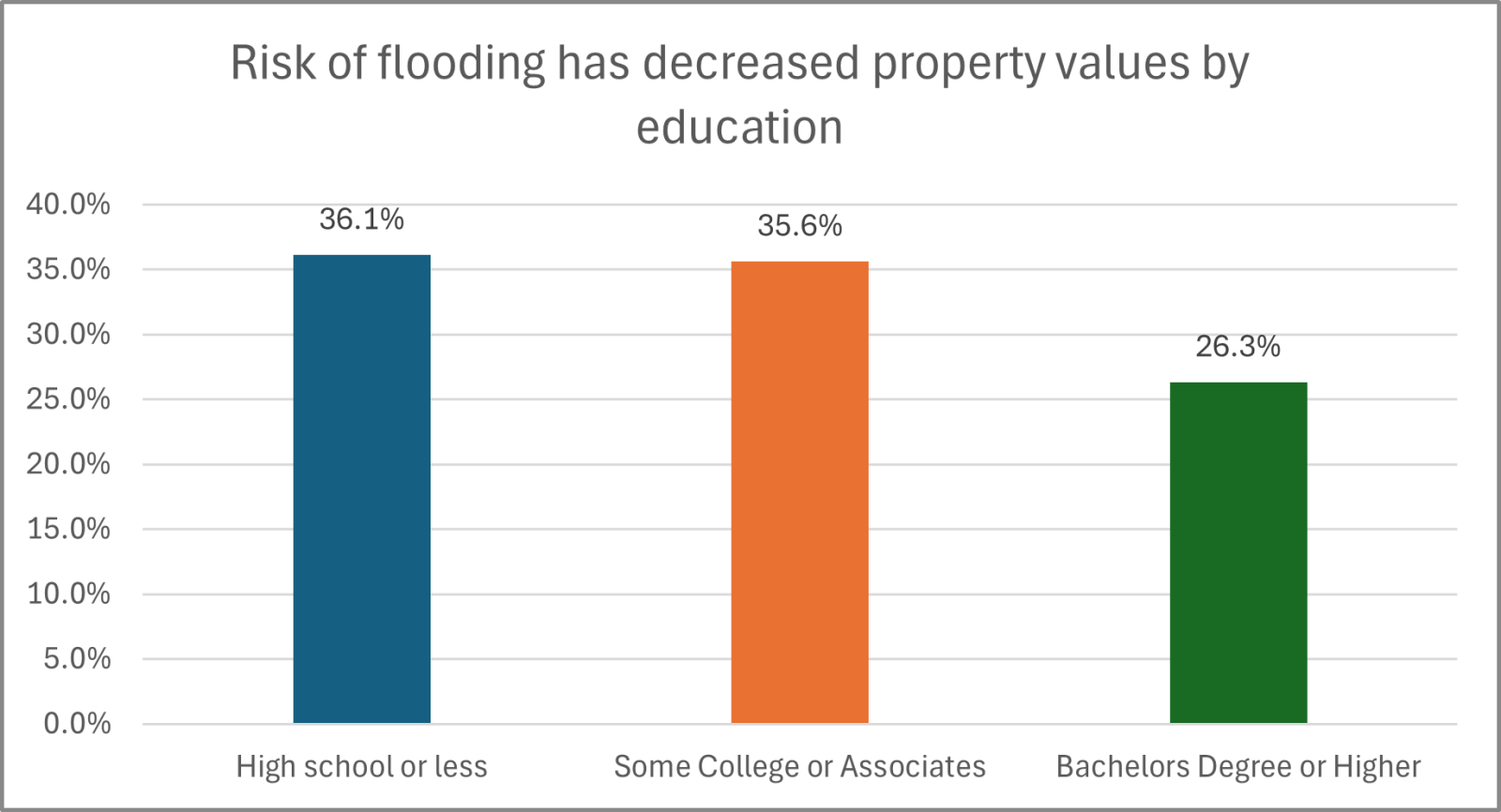 The most highly educated respondents were less likely to think the risk of flooding has decreased property values in their area than those with less education. Just over a quarter (26.3%) of respondents with bachelor’s degrees or higher reported that the risk of flooding has greatly or somewhat decreased property values where they reside while more than a third of those respondents with a high school degree or less (36.1%) responded this way as did those with some college or an associate’s degree.
