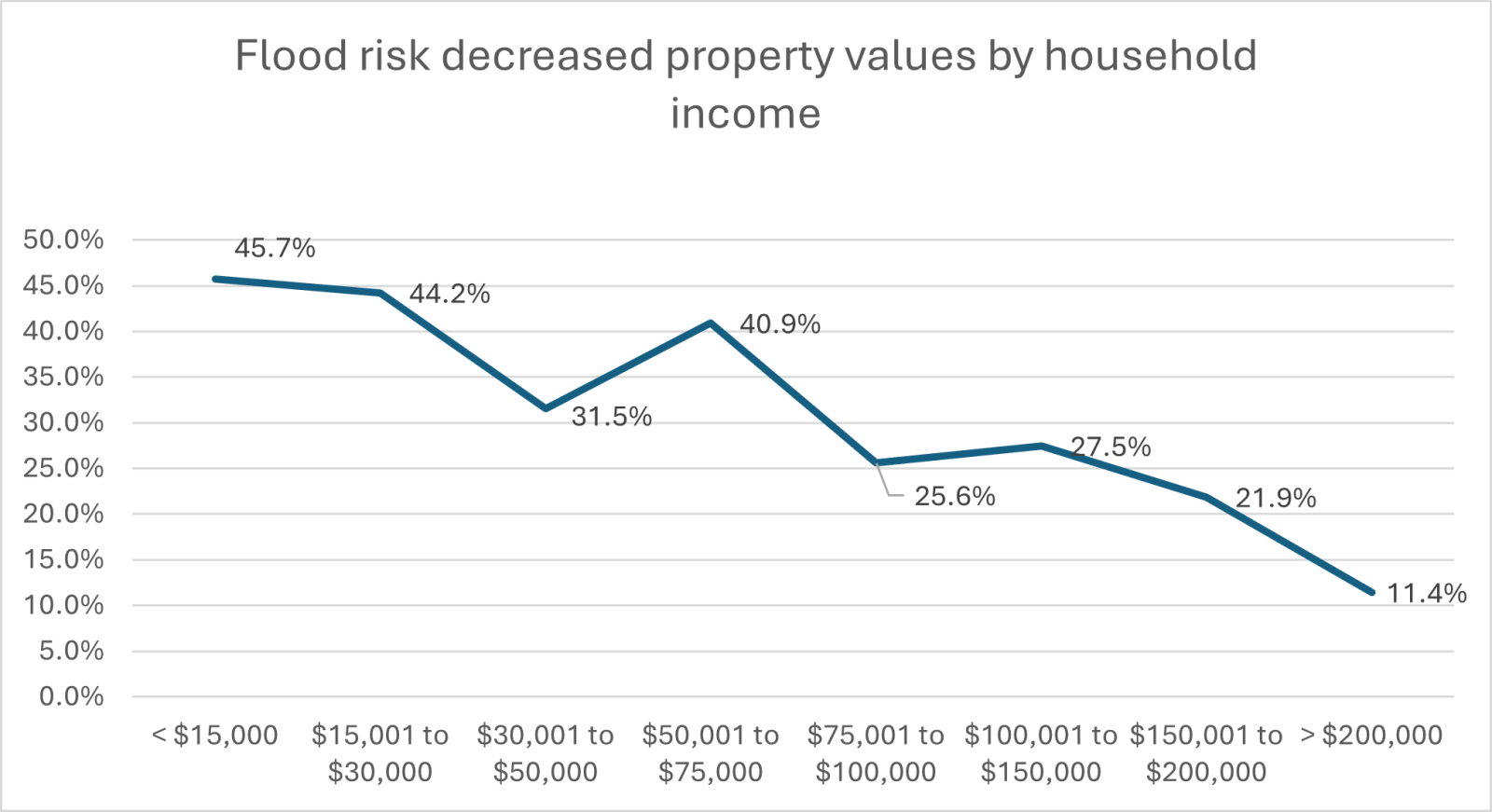 We also find that the respondents with lower household incomes also report decreased property values in their area due to risks of flooding. As can be seen in the figure below, about 45% of the respondents reporting less than $15,000 or between $15,000 and $30,000 in household incomes (45.7% and 44.2%, respectively) believe that the risk of flooding has somewhat or greatly decreased property values where they live. This percentage drops significantly as self-reported household incomes increase to 11.4% of those who report household incomes greater than $200,000. These results, which indicate that African Americans as well as persons with less education and wealth are more greatly affected by flood risk, have been found elsewhere2. Although the relationship can be complex, these data show that lower socioeconomic status is related to vulnerabilities due to flooding.