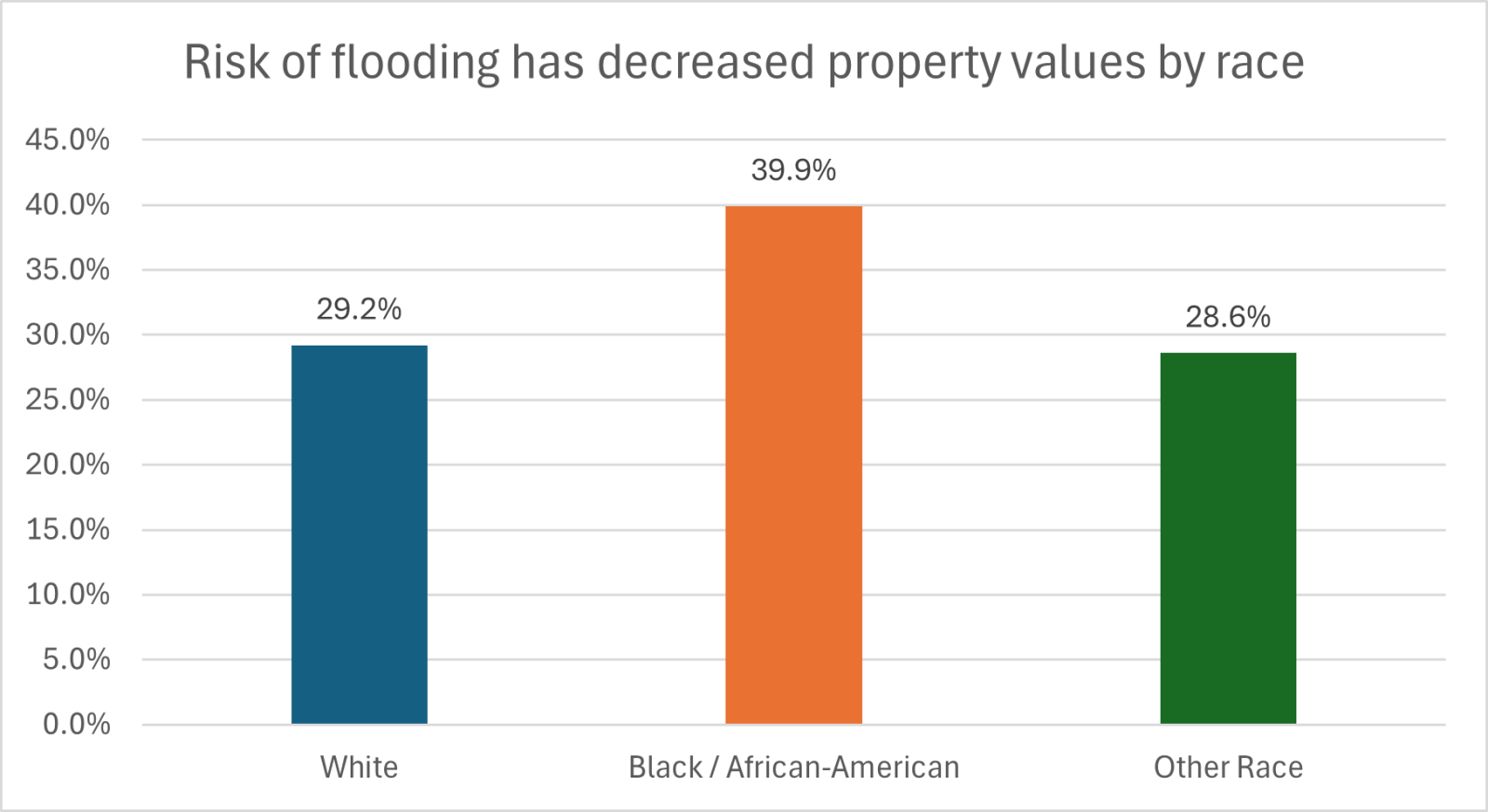 At nearly 40%, African Americans are significantly more likely than whites (29.2%) or those describing themselves otherwise (28.6%) to believe that flooding risk has decreased property values in the area where they live.
