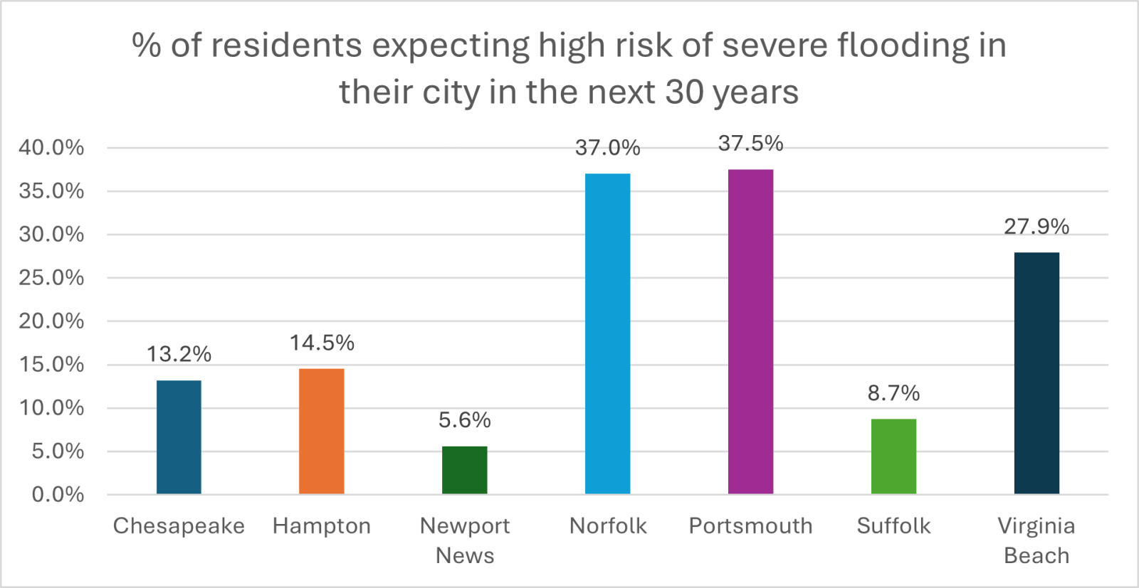 The figure below shows city variation in residents who think their city is at “high risk” for severe flooding in the next 30 years. Well over a third of Norfolk and Portsmouth residents (~37%) and more than a quarter of Virginia Beach residents (27.9%) reported a high risk of severe flooding in the next 30 years. About 13-14% of Chesapeake and Hampton residents project a high risk of severe flooding, while less than 10 percent of Newport News and Suffolk respondents rate their city’s risk as high (5.6 and 8.7%, respectively).