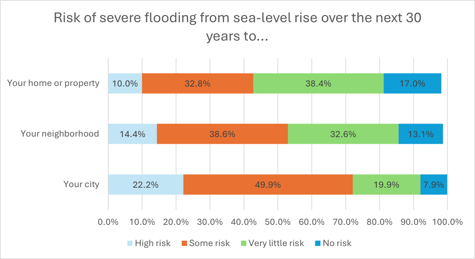 Many of the coastal cities of Hampton Roads are dealing with both sea level rise and land subsidence which increases the risk of flooding and impacts the lives and daily routines of residents. Respondents were asked to describe the risk to their city, neighborhood, and home/property due to severe flooding from sea level rise over the next 30 years. Nearly half of residents surveyed reported some risk of severe flooding to their city and 22.2% believe their city is at a high risk. Regarding flooding in their neighborhood over the next 30 years, 38.6% of residents believe there is some risk and 14.4% believe their neighborhood will be at high risk in the future. Residents were also asked about the risk of flooding to their home/property and 32.8% believe their home/property has some risk for severe flooding and 10% of residents believe their home/property is at a high risk of severe flooding over the next 30 years.
