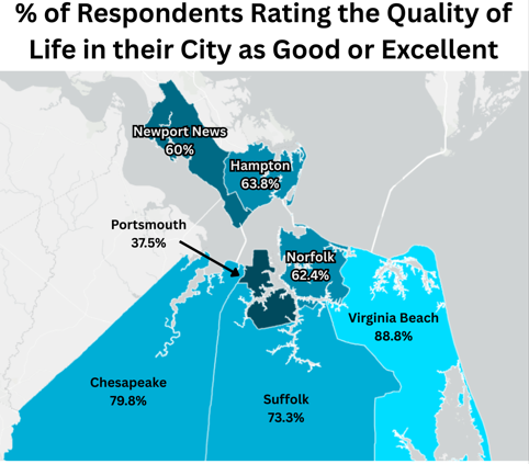 Consistent with previous years, respondents rated the quality of life in their city and their neighborhood higher than they did for the region as a whole. Over two-thirds rated the quality of life in their city as good or excellent (71.4%) and 22.2% rated the quality of their city as fair. Only 4.9% rated their city’s quality of life as poor. As in past years, the quality of life ratings vary by city with 88.8% of Virginia Beach respondents rating their city as excellent or good, as did 79.8% of respondents from Chesapeake and 73.3% of respondents from Suffolk. About 60% of respondents from Norfolk, Newport News, and Hampton also rated their city quality of life as excellent or good. Portsmouth had the lowest percentage of excellent or good ratings at 37.5%.