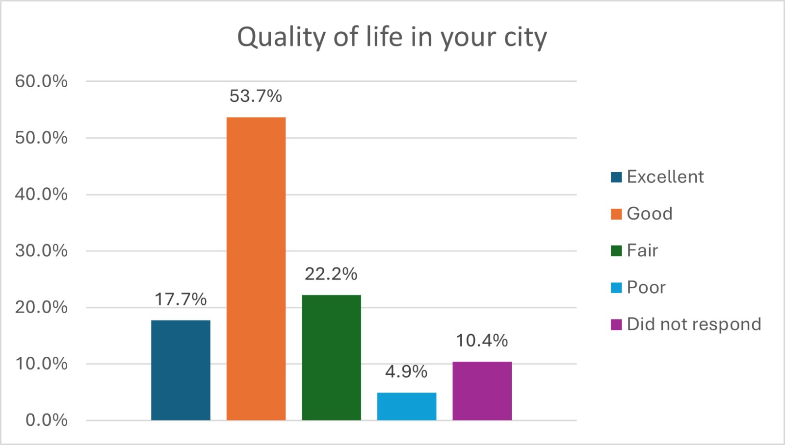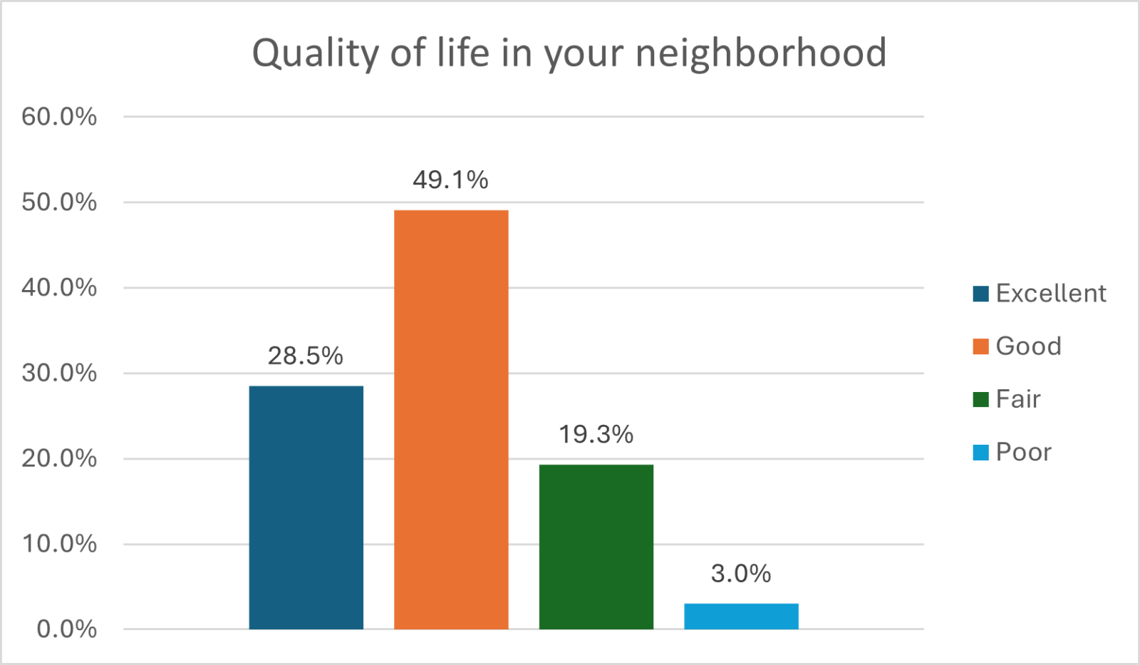 Quality of life ratings in neighborhoods were the highest, with 77.6% rating their neighborhood as excellent or good. Only 19.3% rated their neighborhood quality of life as fair and 3% rated it as poor.