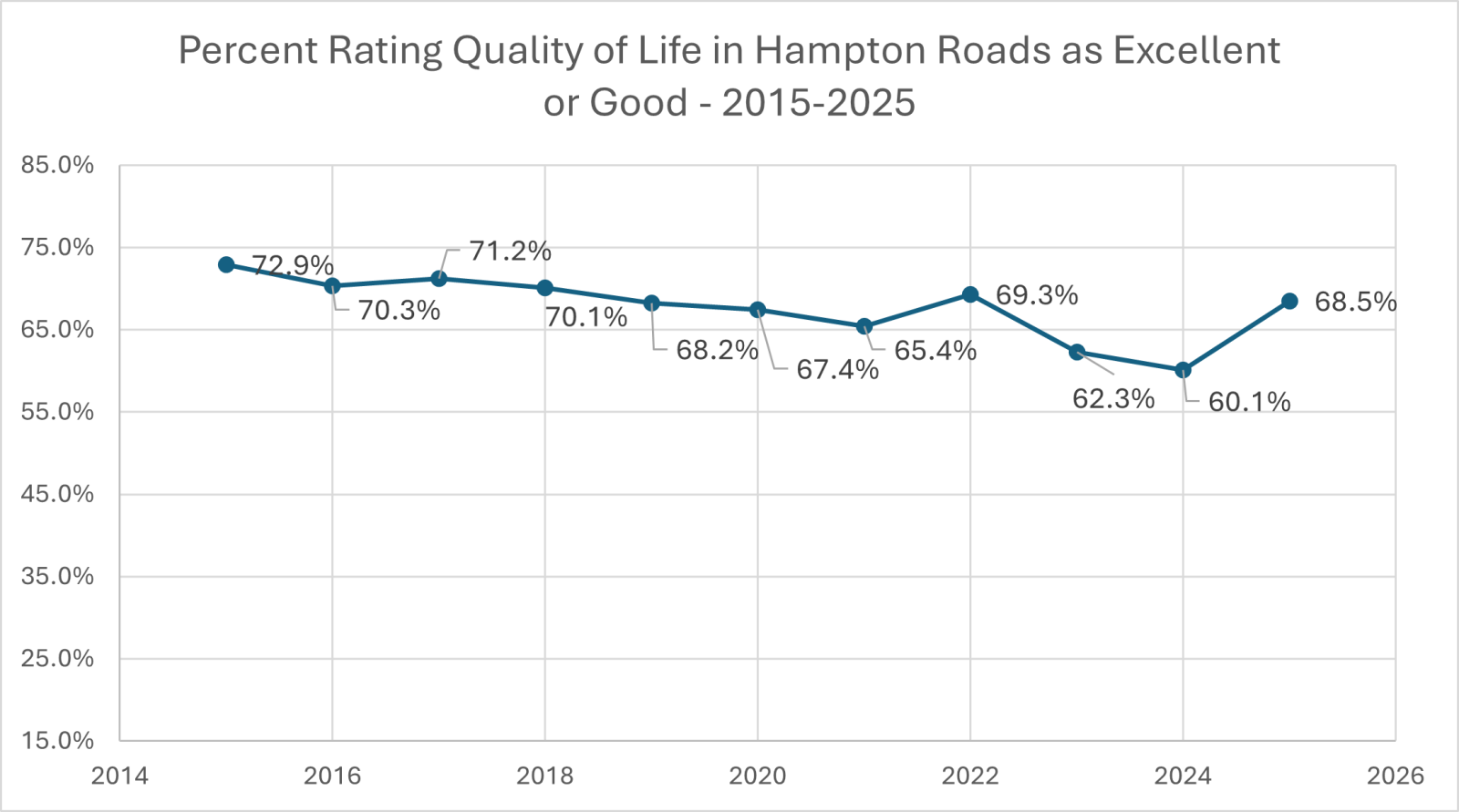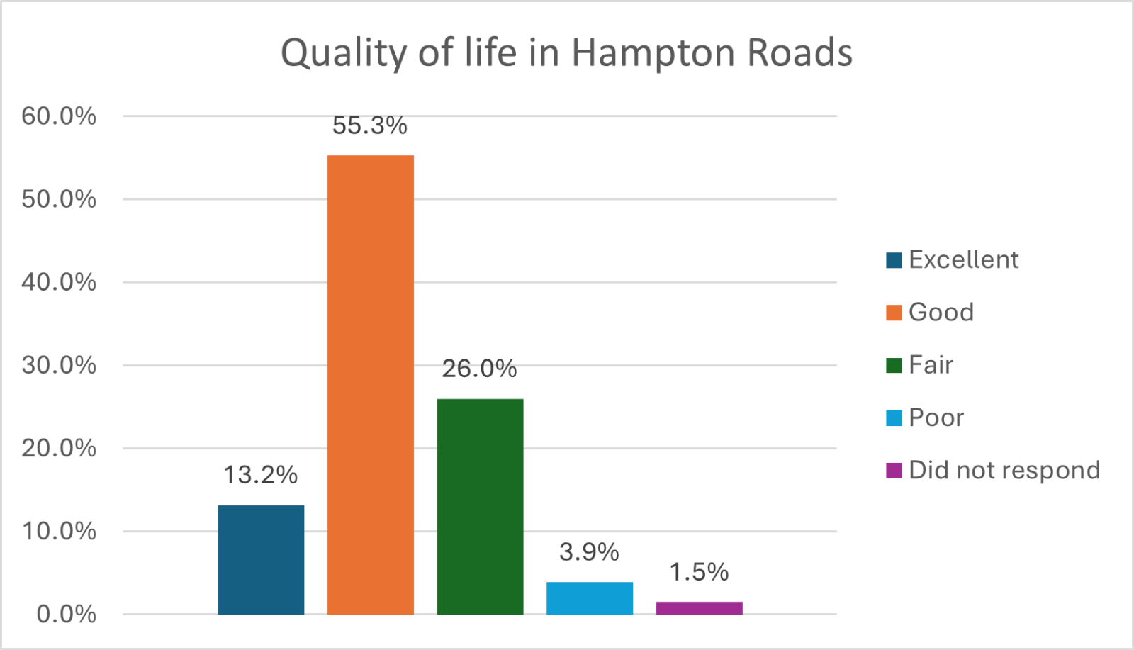 Over two thirds of respondents rated the quality of life in the region as excellent or good (68.5%). This is higher than the last few years and is similar to pre-COVID ratings (ranging from 68% to 71% between 2017-2019[1]). Over a quarter rated Hampton Roads’ quality of life as fair (26.0%) and 3.9% rated it as poor.