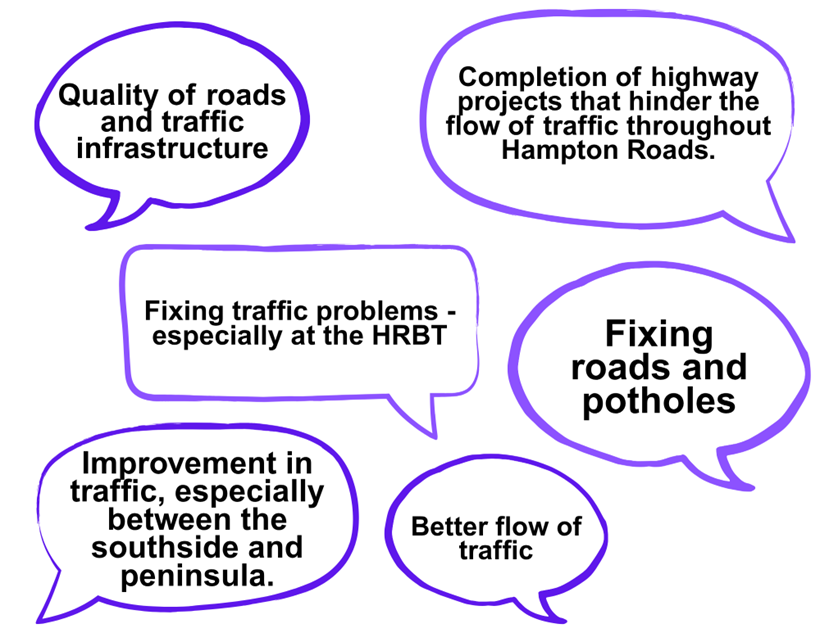 After providing their quality of life ratings, respondents were asked a follow-up question: What is the one thing that would most improve the quality of life in Hampton Roads? The responses were reviewed and coded to identify major themes. The most frequent theme among the responses was improving roads, completing road infrastructure projects, as well as improving traffic. Some example responses are noted below: