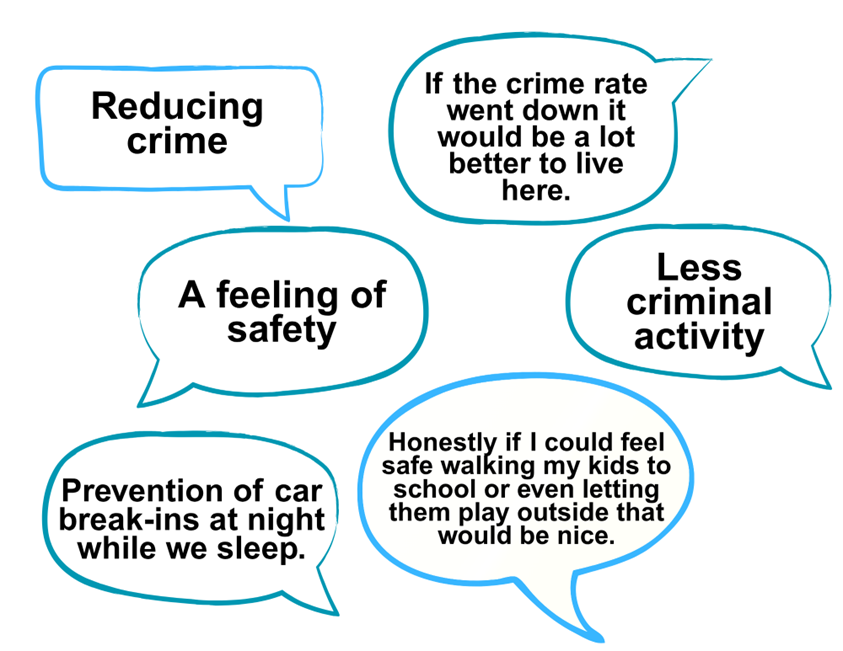 The second most frequent theme observed in the responses was the need to lower crime and to increase safety. Respondents said: