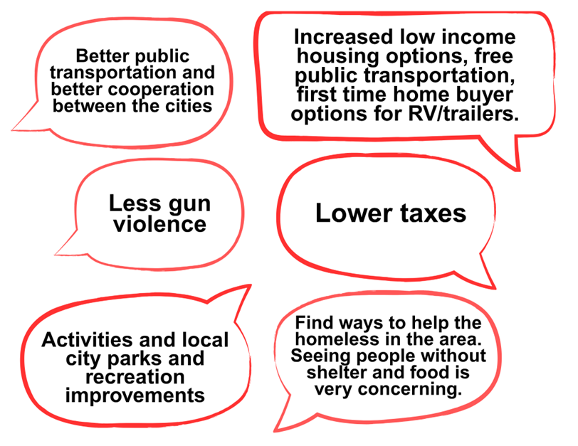 Respondents mentioned other ways to improve quality of life in the region including addressing homelessness, public transportation, gun control and violence, fewer and lower taxes, and more/varied activities and events in the region