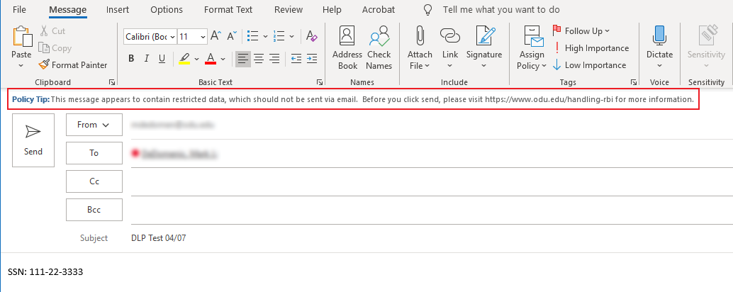 We have enabled a tool that detects character strings that might contain personally identifying information. If you attempt to send an email and Outlook detects numbers arranged in the format of a social security number, for example, a warning will pop up asking if you're sure you want to send the message.